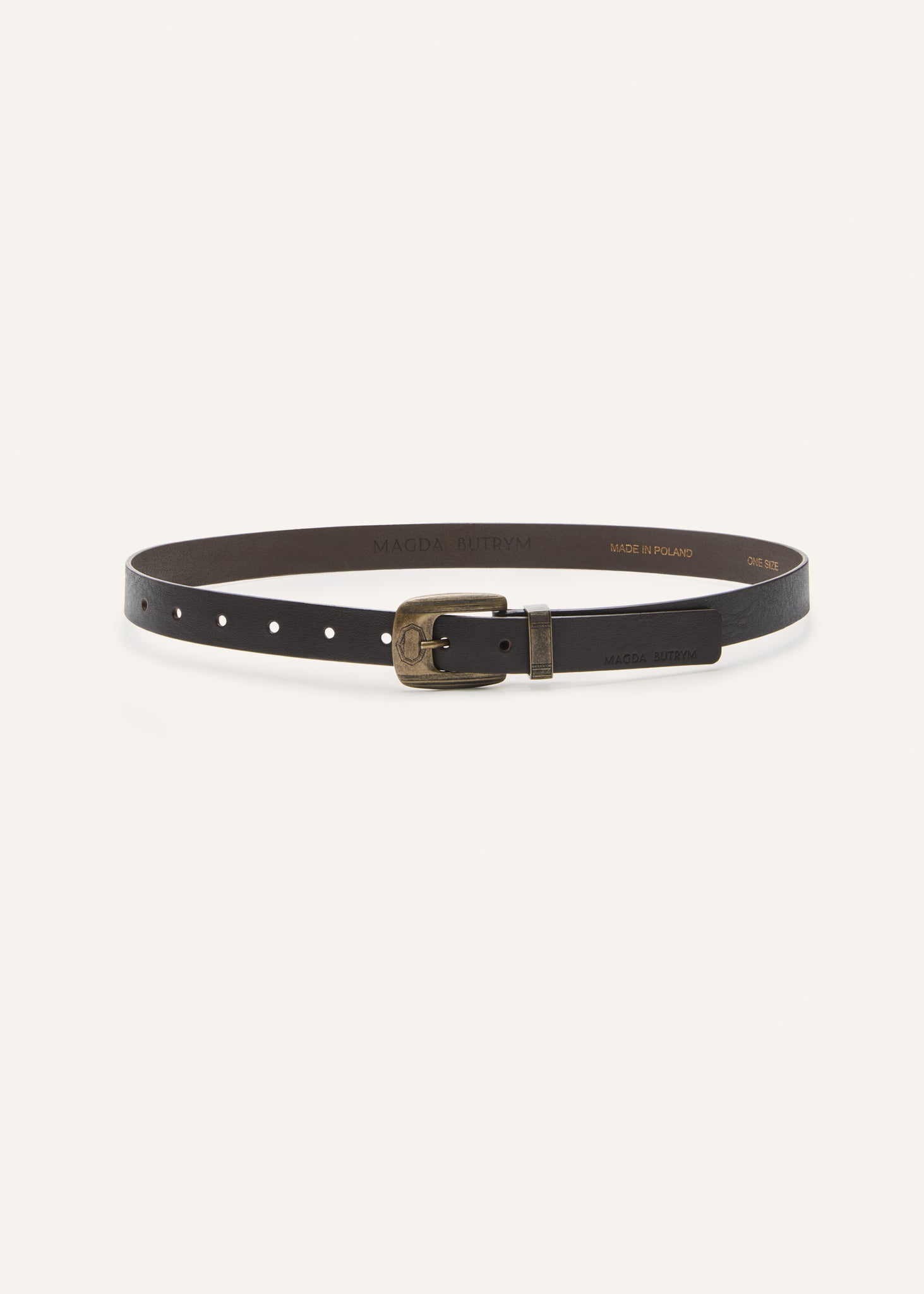 Leather belt featuring a rectangular buckle and loop in antique-effect brass. Clean lines meet vintage hardware in a minimal, Western-inspired silhouette.
