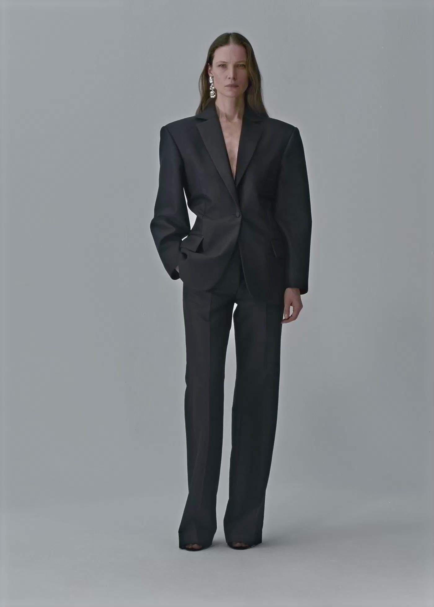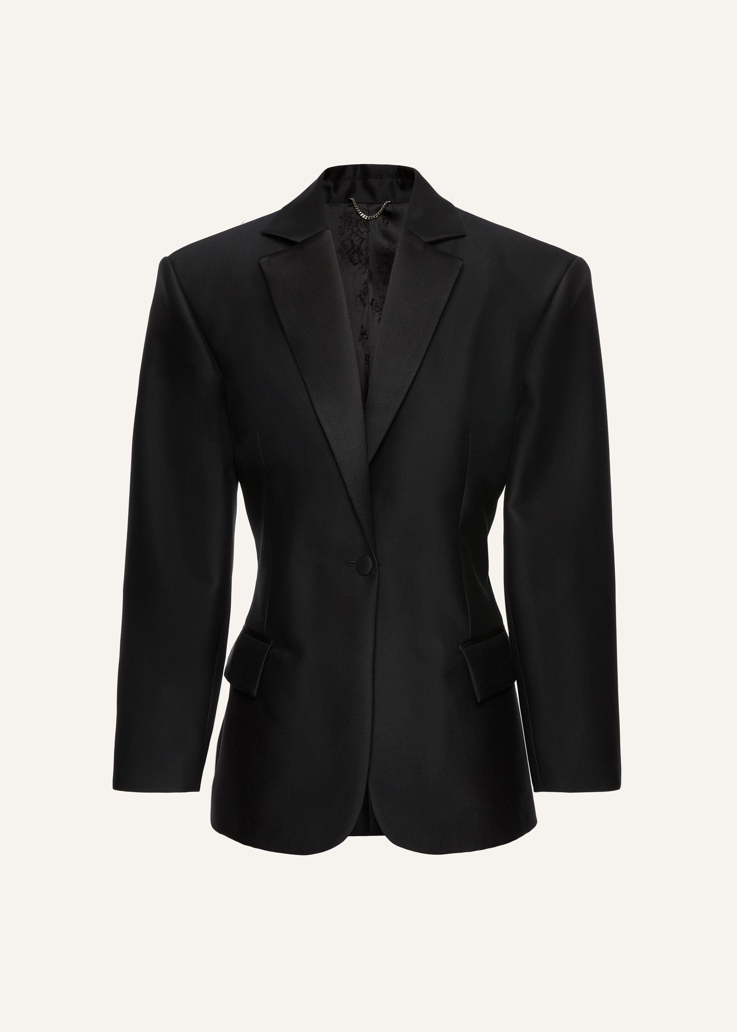 A classic silhouette reimagined in wool and silk, with satin lapels and a cinched back.
