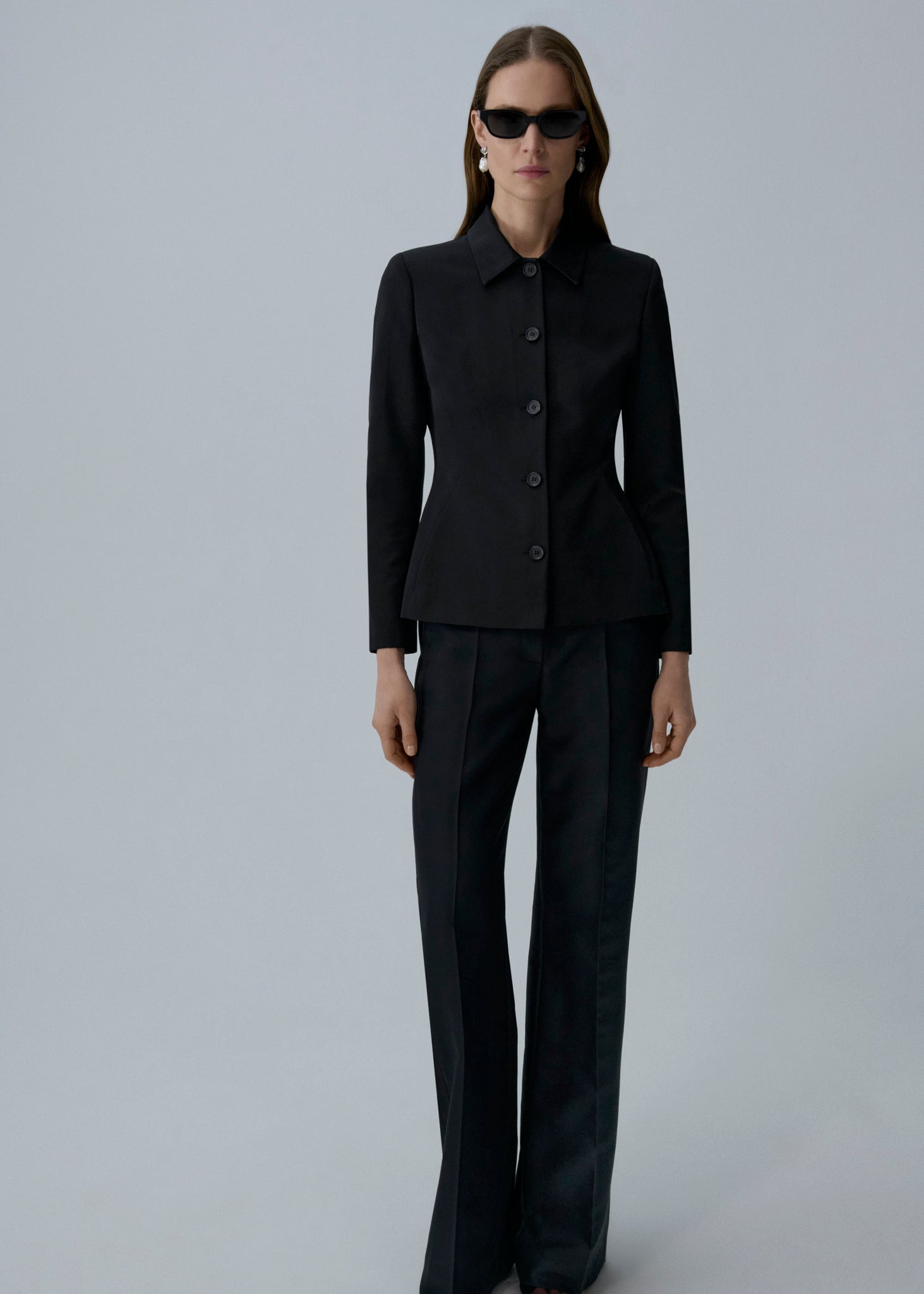 This fitted blazer is crafted from a luxurious blend of cotton and cashmere and tailored to subtly enhance the natural waist, creating a soft hourglass silhouette. It features a classic shirt-style collar, button-down front, and structured shoulders, combining timeless elegance with modern precision.