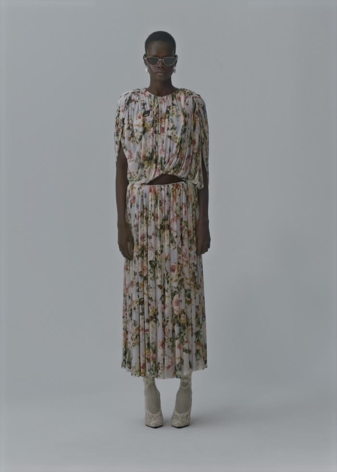 A sleeveless top with a round neckline and voluminous silhouette, created by heavy ruching at the shoulders and hem. Structured with shoulder padding and a gathered bubble hemline. The hem is cinched with elastic band.