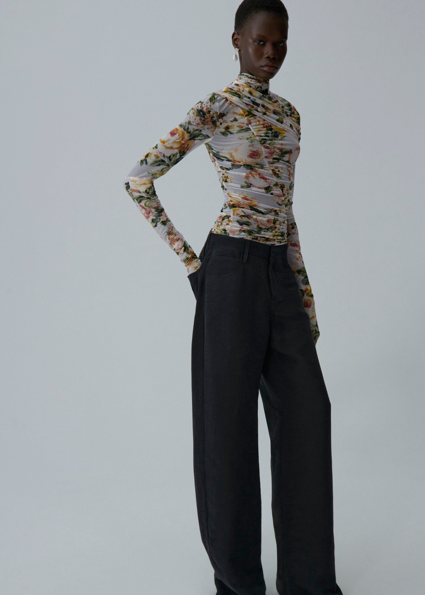A fitted long-sleeve top crafted from lightweight cupro mesh, featuring diagonal ruching across the front and sides for a sculpted silhouette. A high ruched collar and an asymmetric sheer cape overlay that drapes from the left shoulder to the right. Closes with a concealed zip at the center back.
