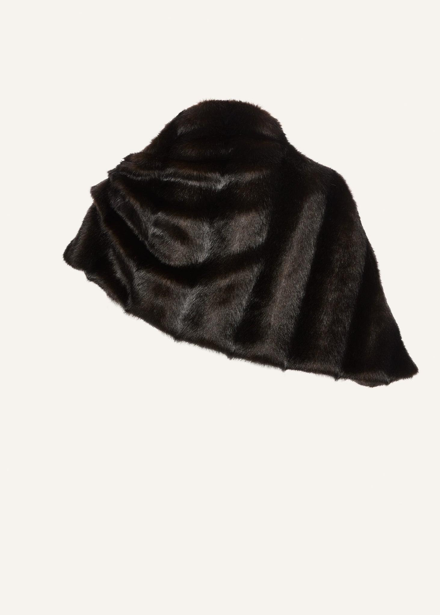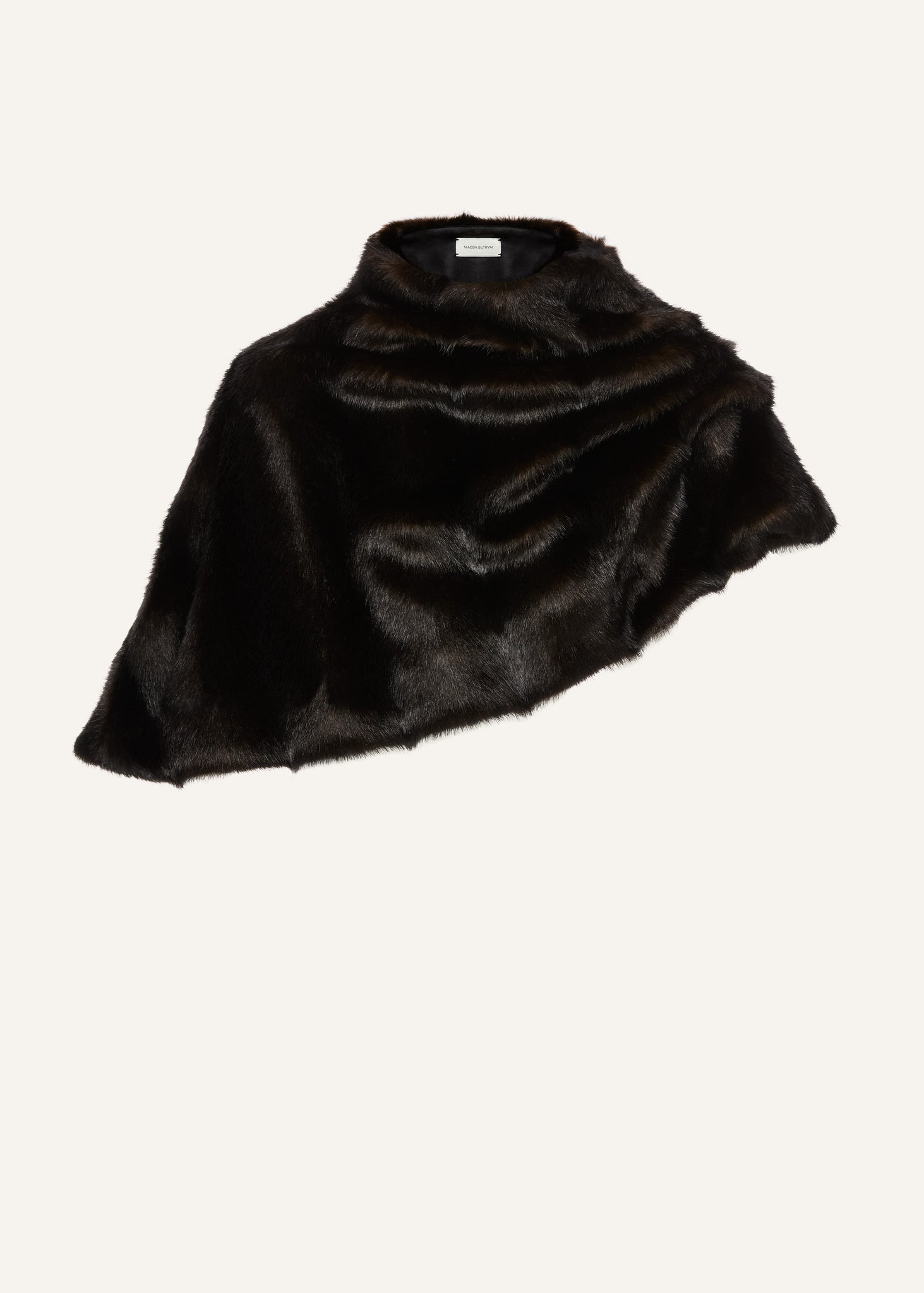 An asymmetrical faux fur wrap featuring soft volume and elegant draping across the left shoulder. Fastens at the neck with two discreet hook-and-eye closures and is fully lined with silk.