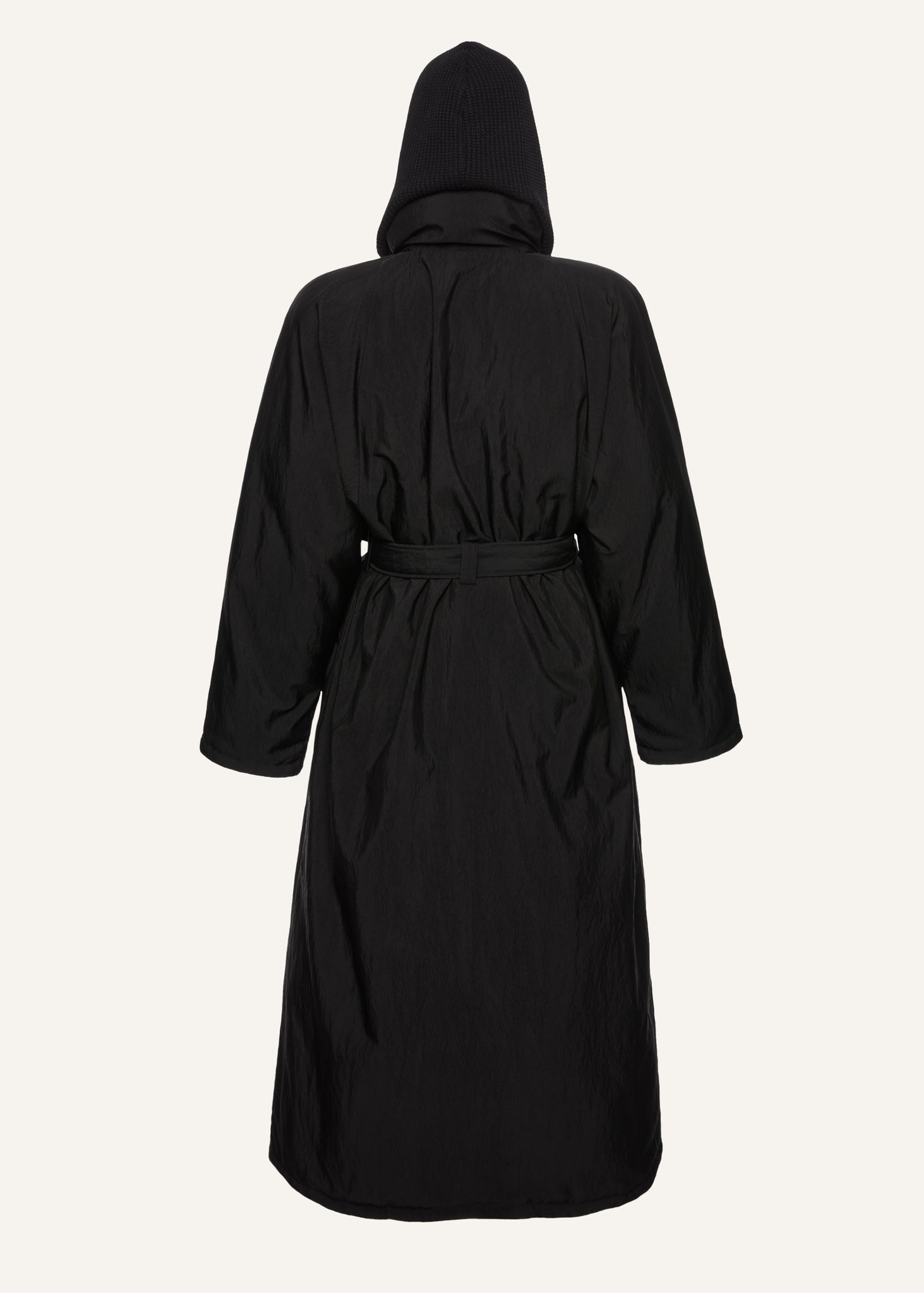 A modern update to classic outerwear, it features a tie waist for a defined silhouette and zippered welt pockets for practicality. The standout detail is a detachable cozy knit hood to create a layered effect.