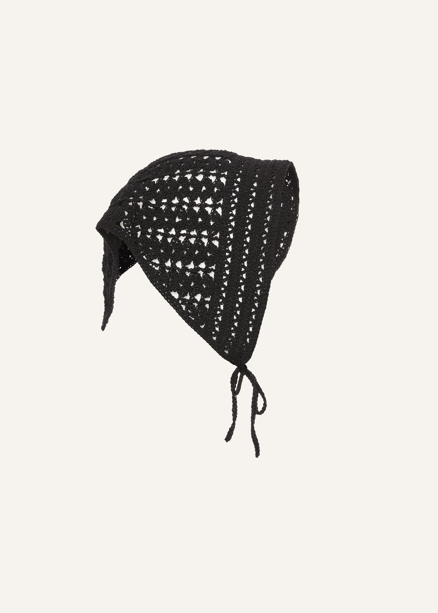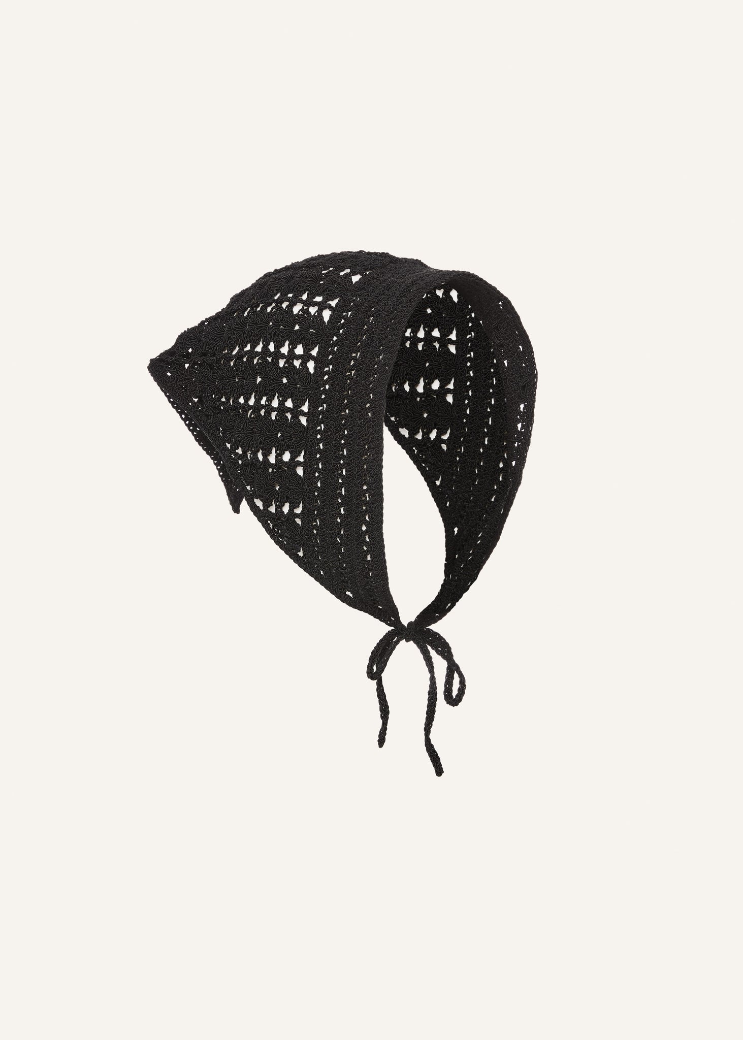 This hand-crocheted headscarf is crafted from soft cotton in an airy openwork pattern. Designed to tie under the chin, it frames the face with quiet romance while lending a touch of folk charm to any look.