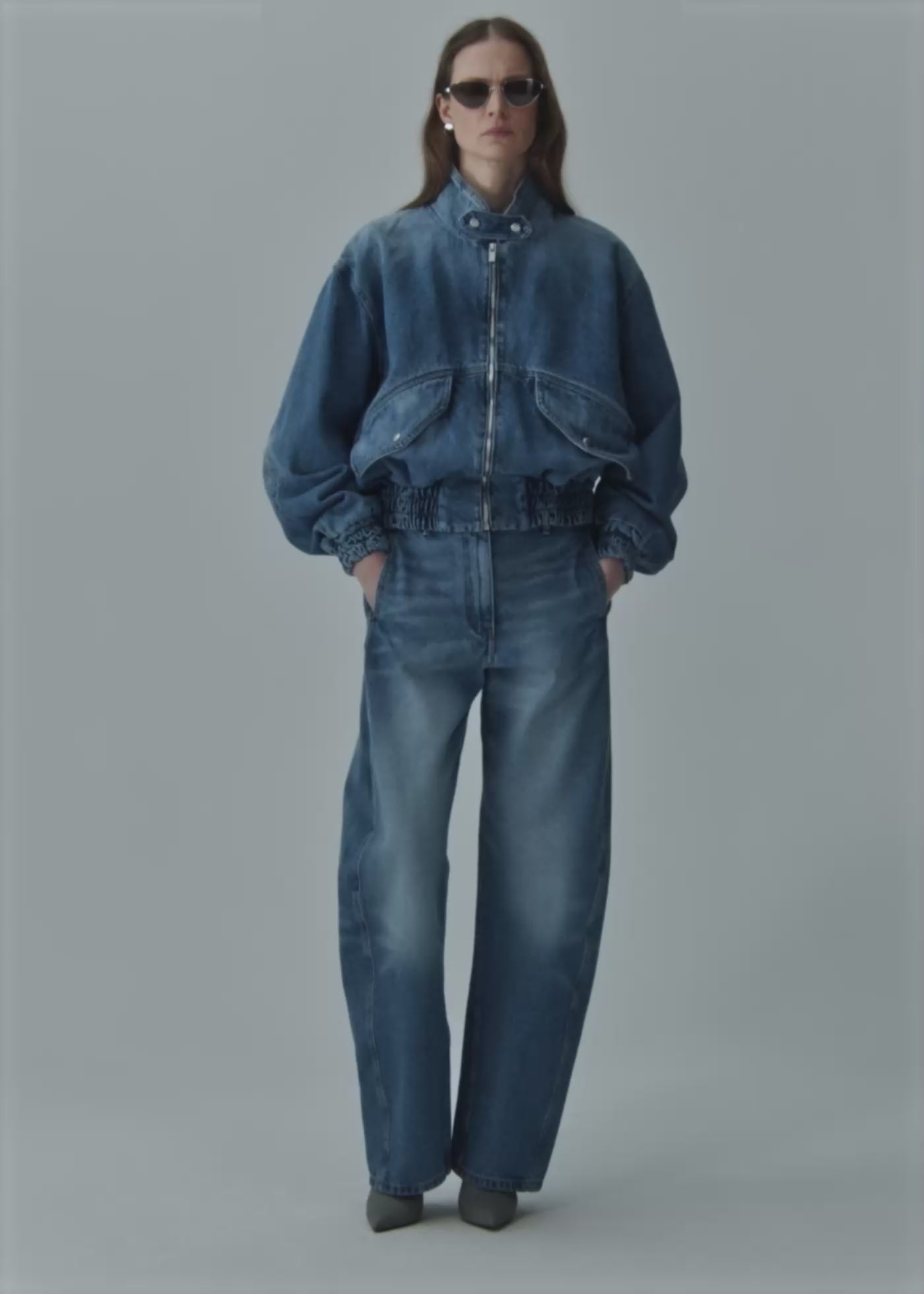 This modern bomber silhouette is reimagined in a structured vintage-wash denim with elasticated cuffs and hem for a cinched effect. Featuring a high snap-button collar, oversized flap pockets, and a front zip closure, the design offers a bold yet practical statement. A subtle embroidered logo at the back neck adds a signature touch. Both fashion-forward and functional, this jacket is perfect for layering through the seasons.