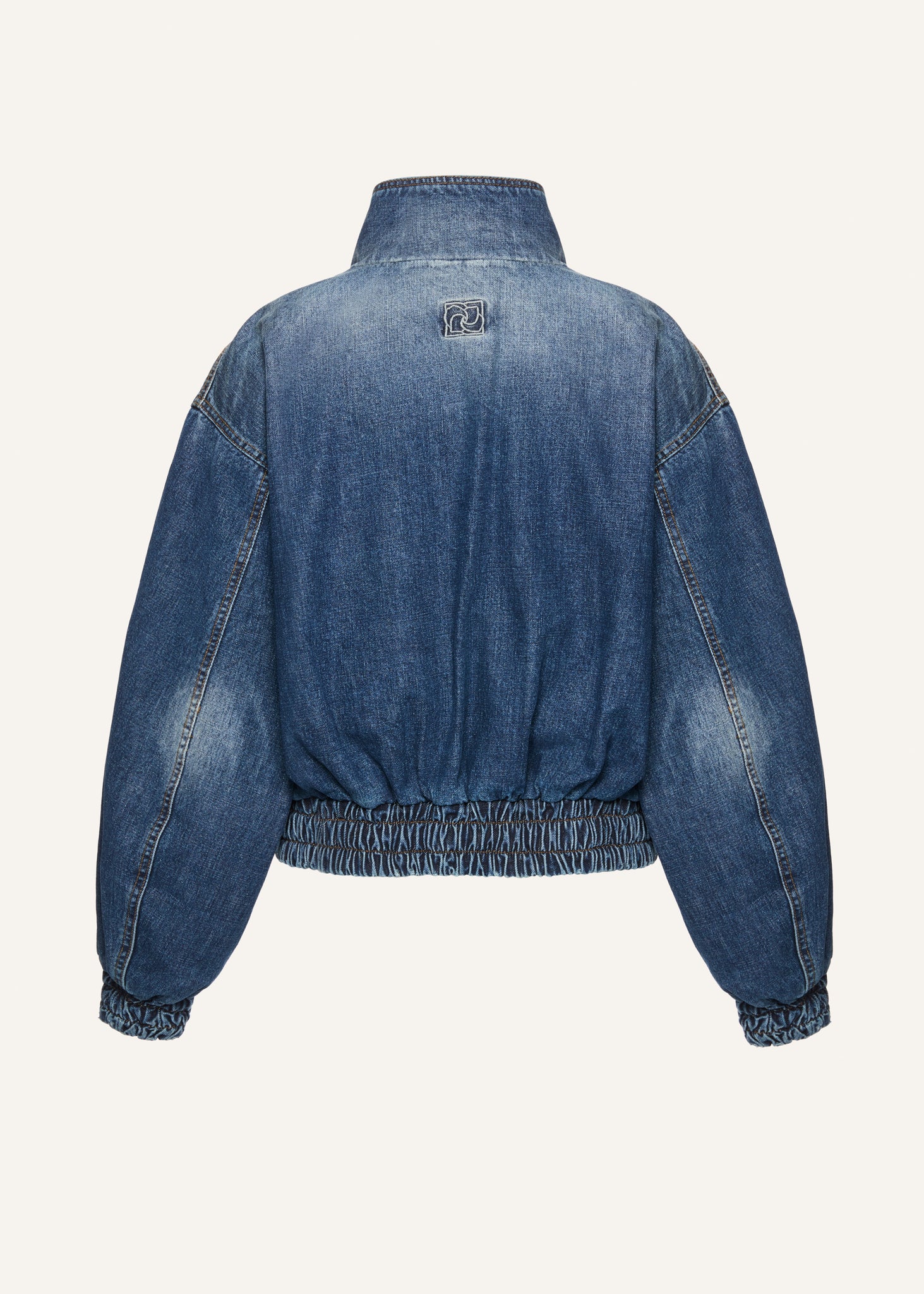 This modern bomber silhouette is reimagined in a structured vintage-wash denim with elasticated cuffs and hem for a cinched effect. Featuring a high snap-button collar, oversized flap pockets, and a front zip closure, the design offers a bold yet practical statement. A subtle embroidered logo at the back neck adds a signature touch. Both fashion-forward and functional, this jacket is perfect for layering through the seasons.