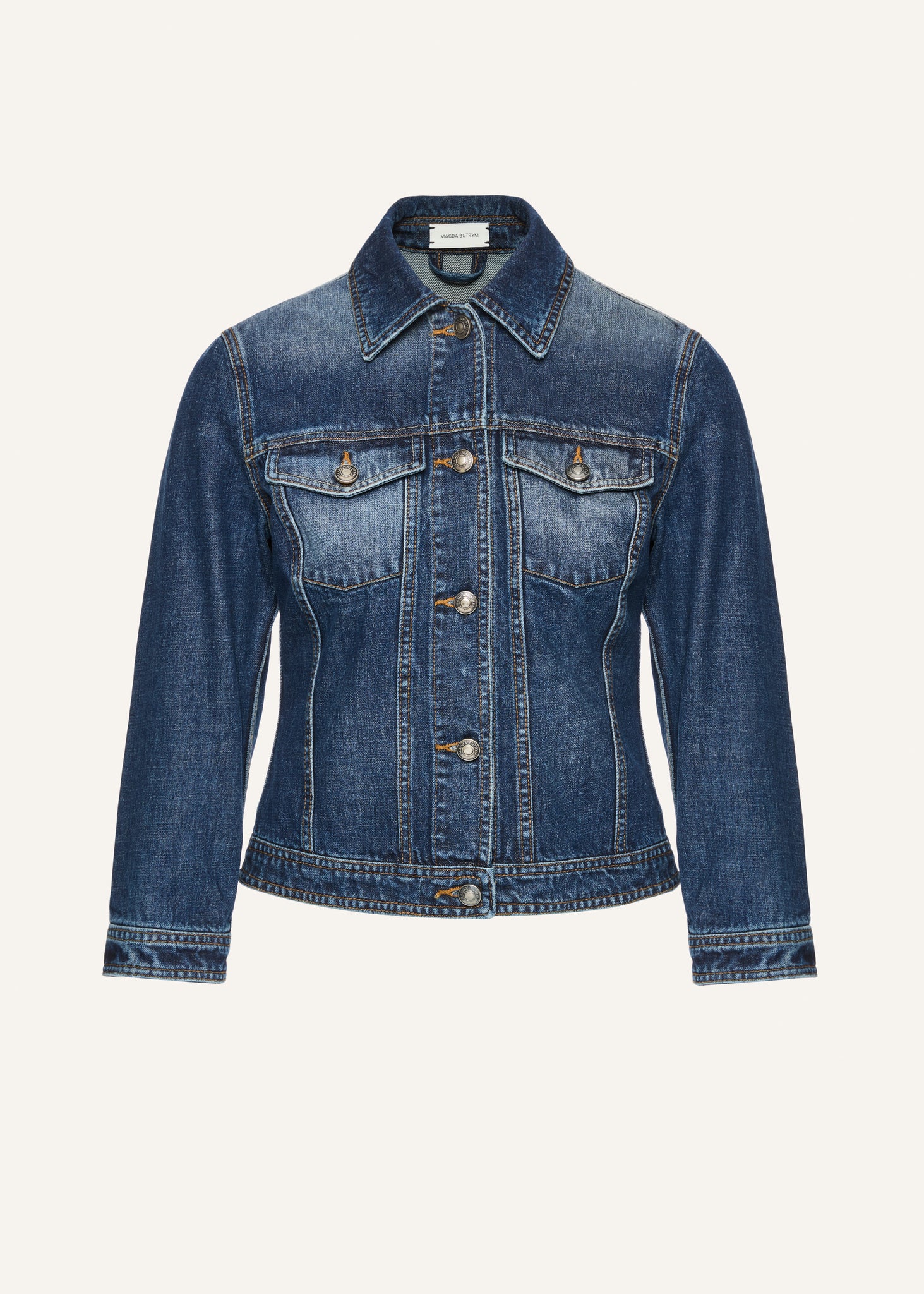 This classic denim jacket is reimagined with a feminine, contoured fit that flatters the silhouette. Chest flap pockets, metal button closures, and structured seams lend an authentic touch, while the branded embroidery at the back adds a signature finish.