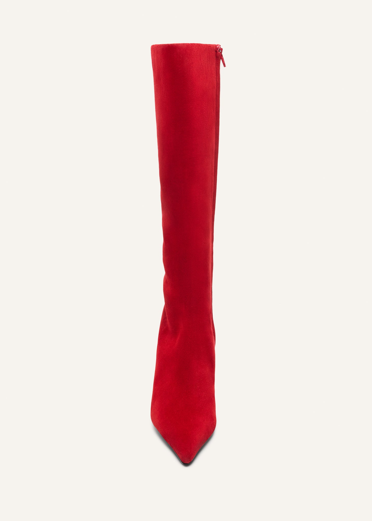 Italian-made from supple suede, these sleek knee-high boots feature a sharp pointed toe and a slim mid-heel for timeless sophistication. An inner side zip allows for easy wear while preserving the boot’s clean, elongated silhouette. Finished with a leather sole, they blend elegance and functionality in a refined everyday design. Heel height is 8,5 cm.