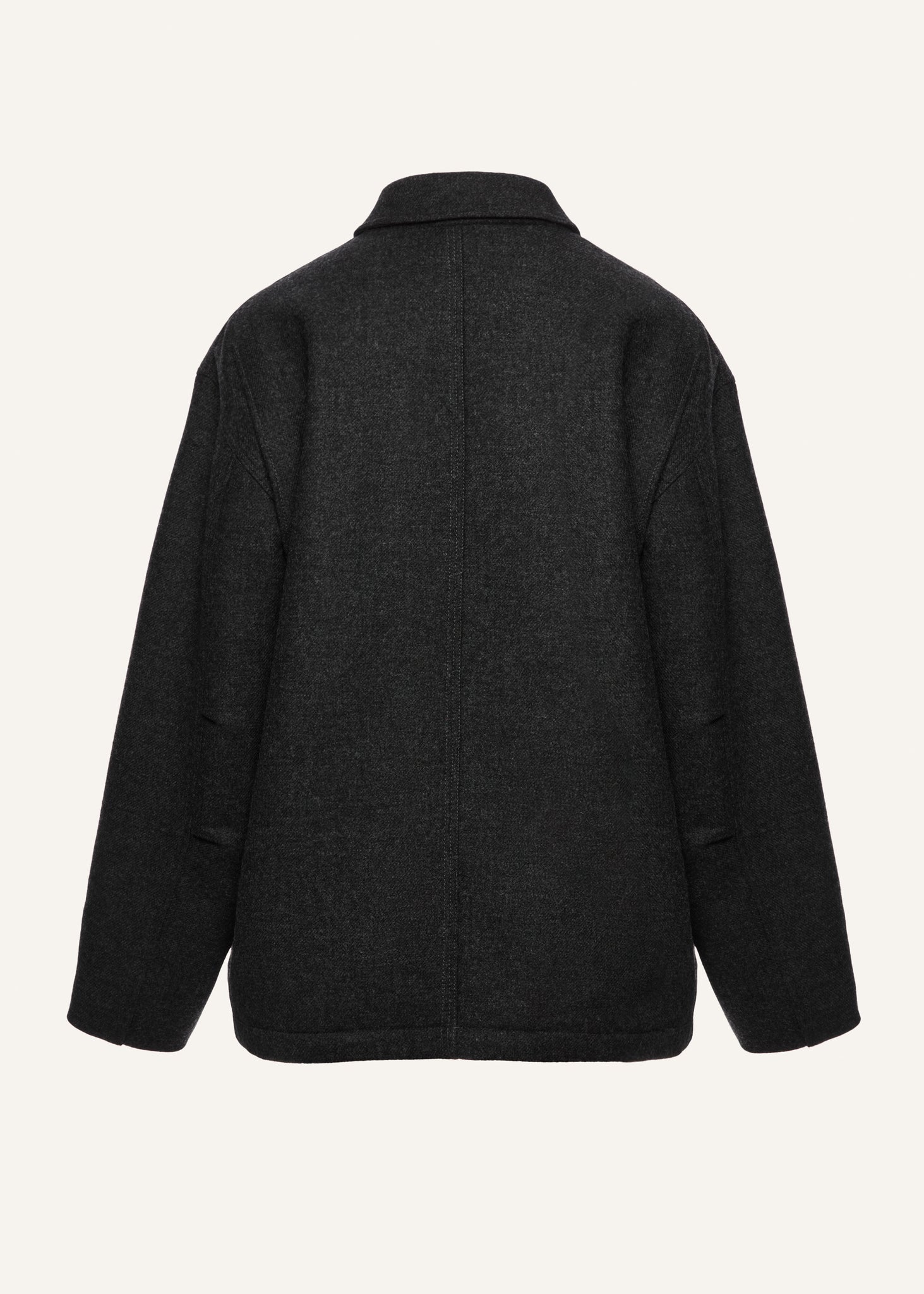 A utilitarian-inspired outerwear piece featuring large flap pockets, hidden snap buttons under a clean front placket, and subtle topstitching throughout. Finished with quilted lining, interior storage pockets, and a drawstring waist for shape.