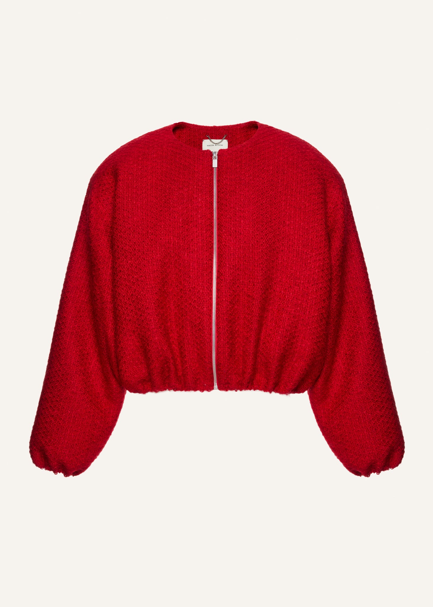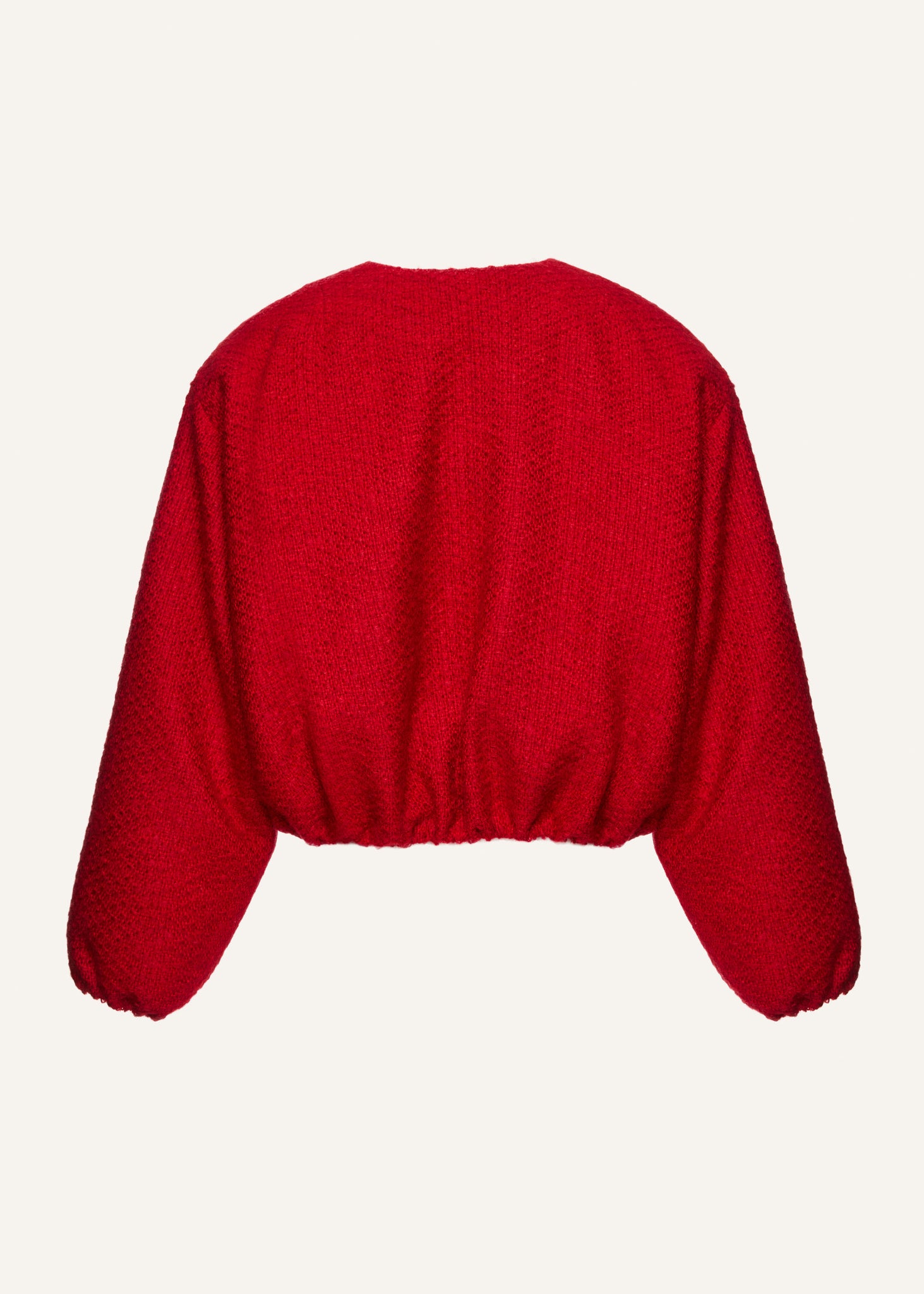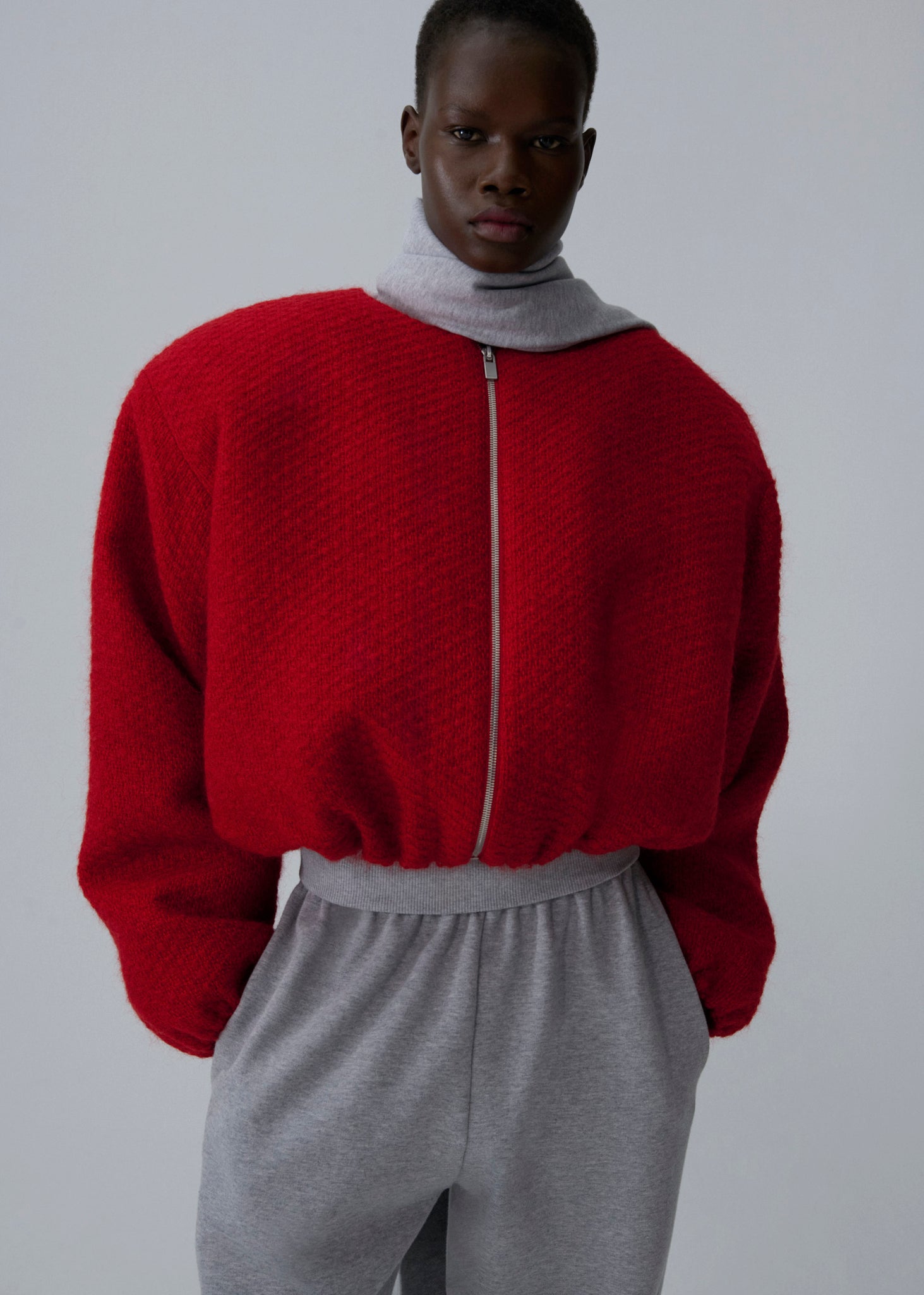 Cropped jacket crafted from loom-woven textured wool, offering a voluminous silhouette that gathers softly at the hem and cuffs with elasticated edges. Fully lined and padded for warmth, it features a clean round neckline, zip-front closure, and side seam pockets with hidden zippers.