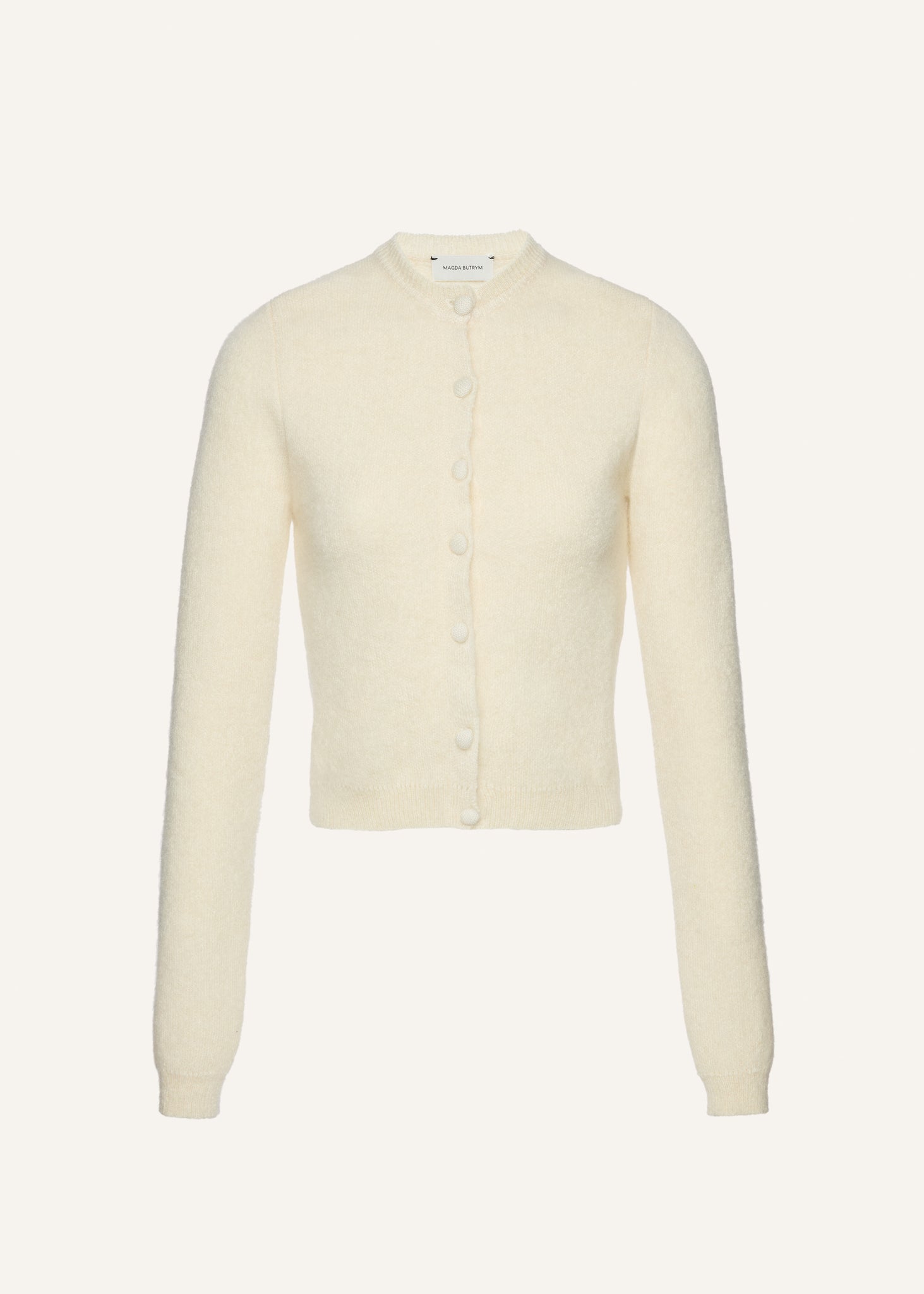 Designed with a close fit to the body, it features a round neckline, tonal covered buttons, and ribbed trim detailing at the cuffs and hem. The minimalist shape is elevated by its luxe texture.