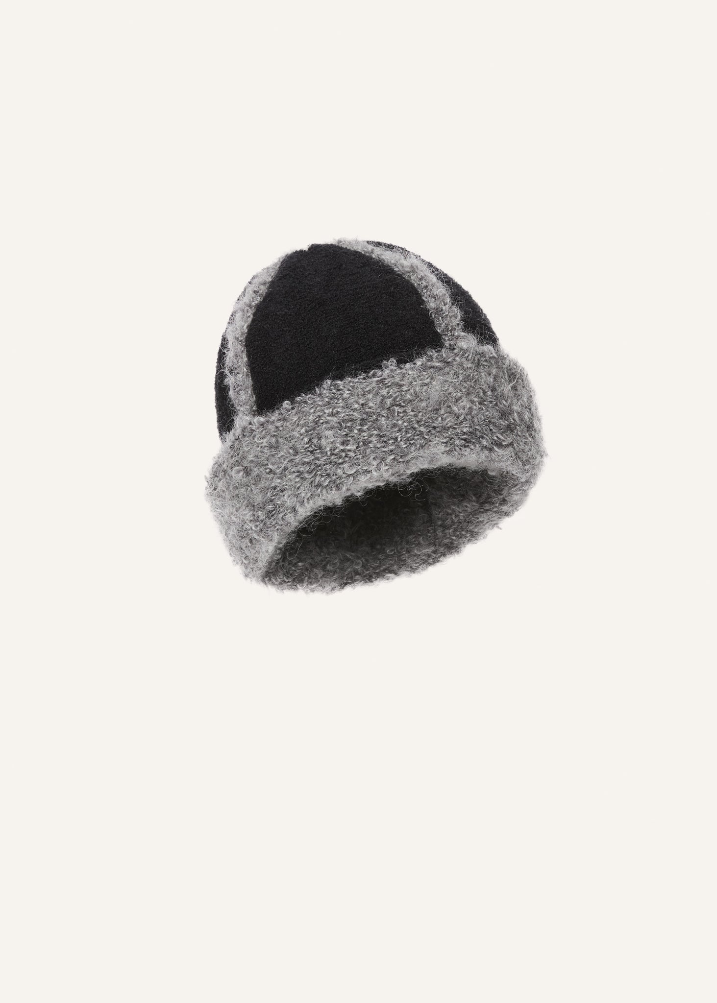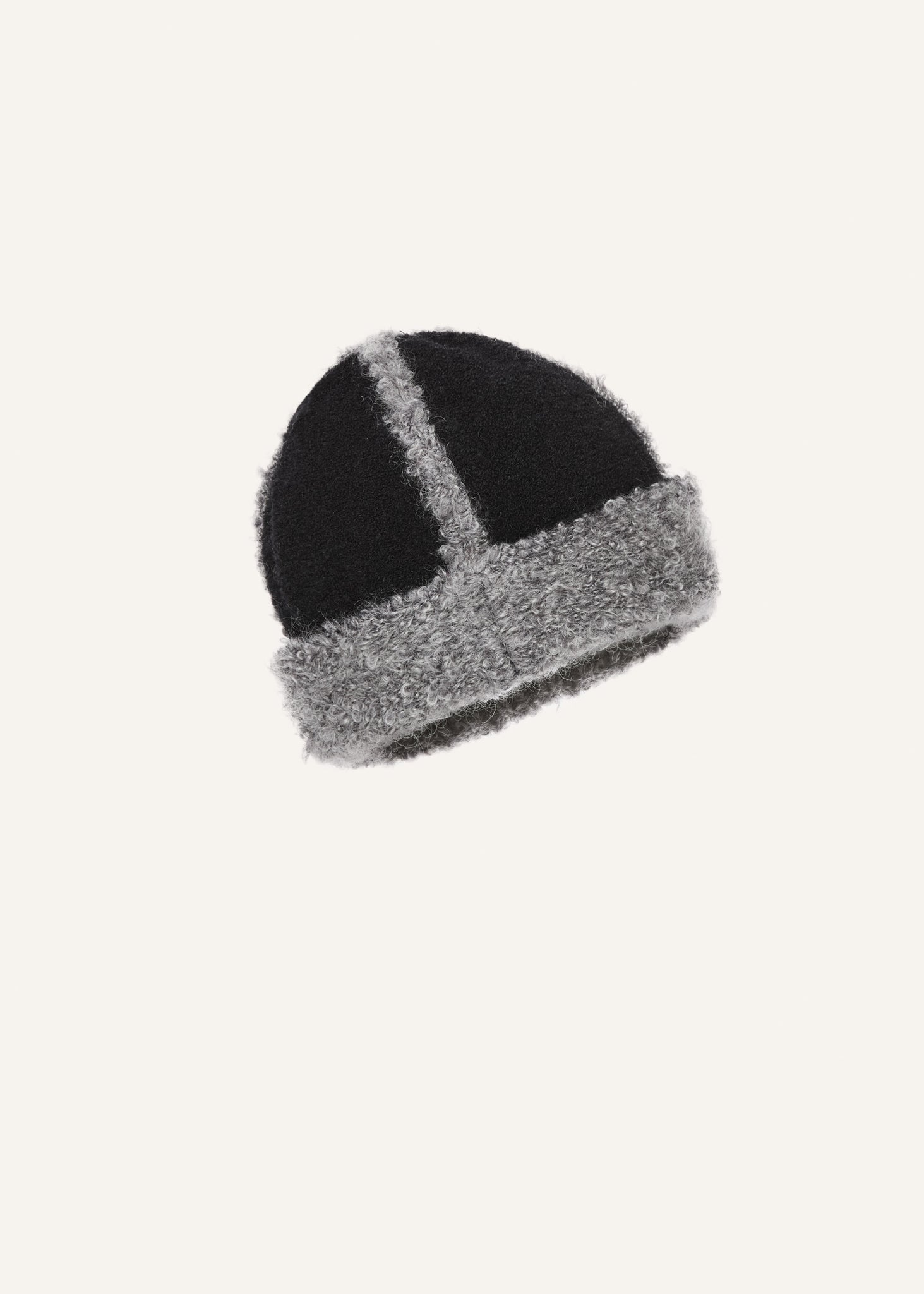 A cozy and stylish hat crafted from a blend of wool, mohair and silk, designed with a plush shearling trim. The rounded silhouette is structured with visible seam detailing, giving it a vintage aviator-inspired charm.