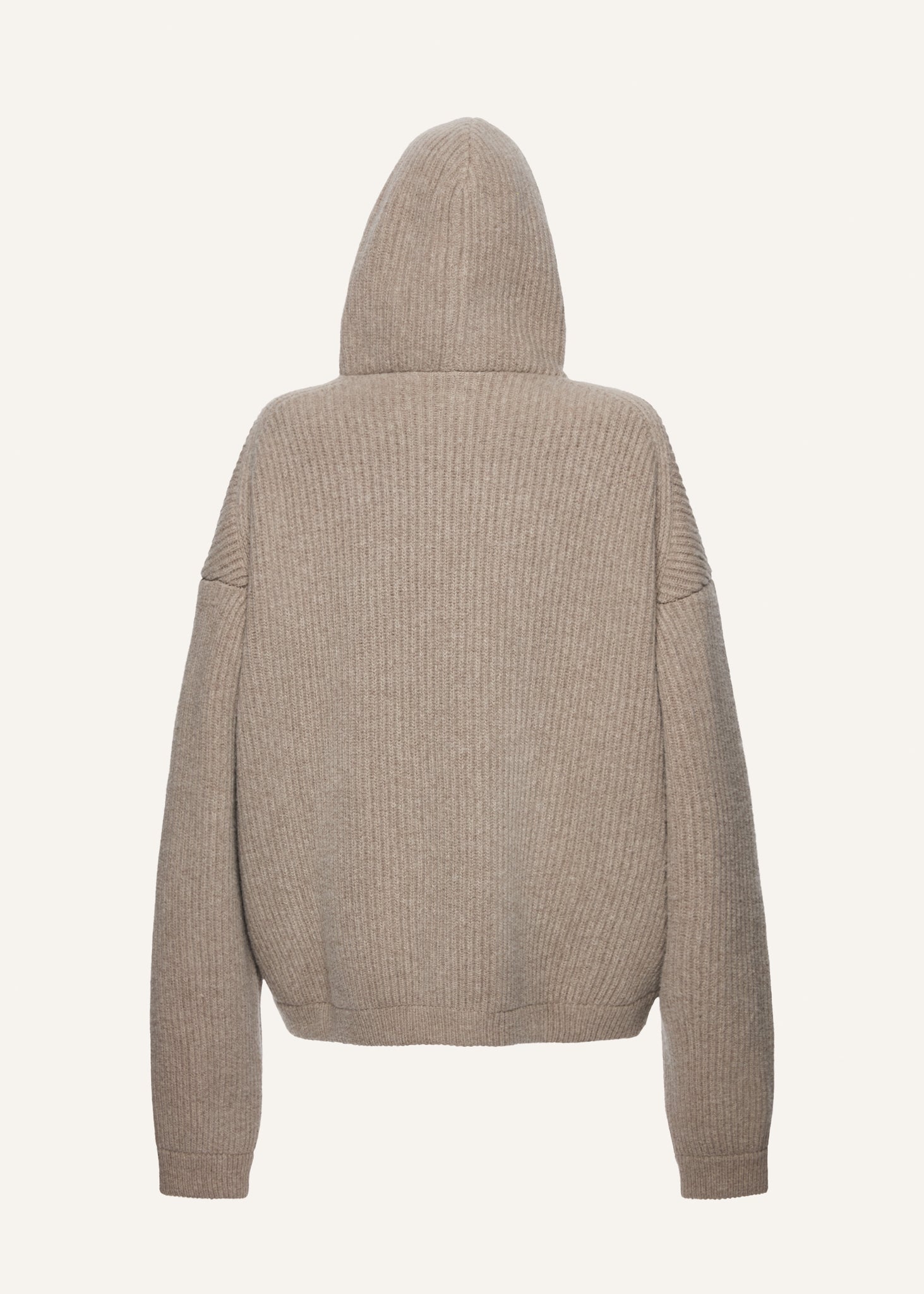 A button-up cardigan crafted from a luxurious wool and cashmere blend, featuring an oversized hood and soft ribbed texture throughout. The relaxed silhouette and dropped shoulders create a laid-back, modern look, while the rich fabric adds warmth and softness.