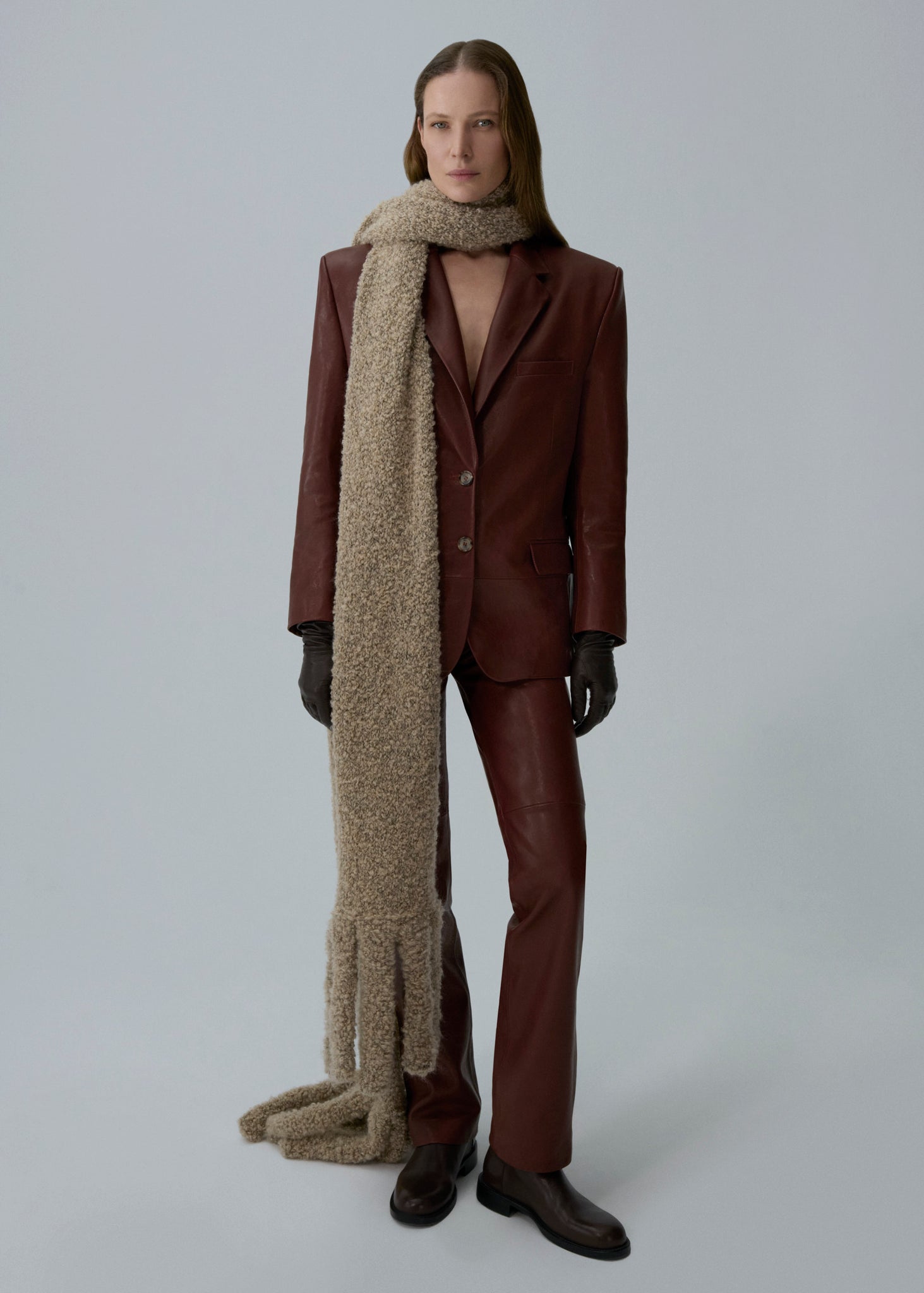 A cozy essential with elevated texture, this long scarf is knit from a plush mohair and wool blend in a versatile warm beige. Finished with oversized fringe ends for added movement and style, it delivers warmth and softness with a sculptural drape—perfect for layering over winter coats or chunky knits.