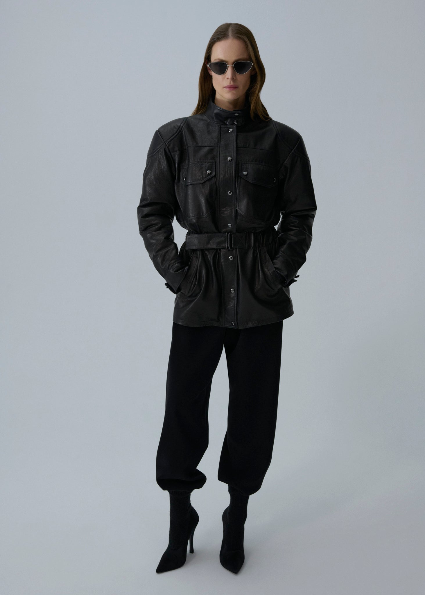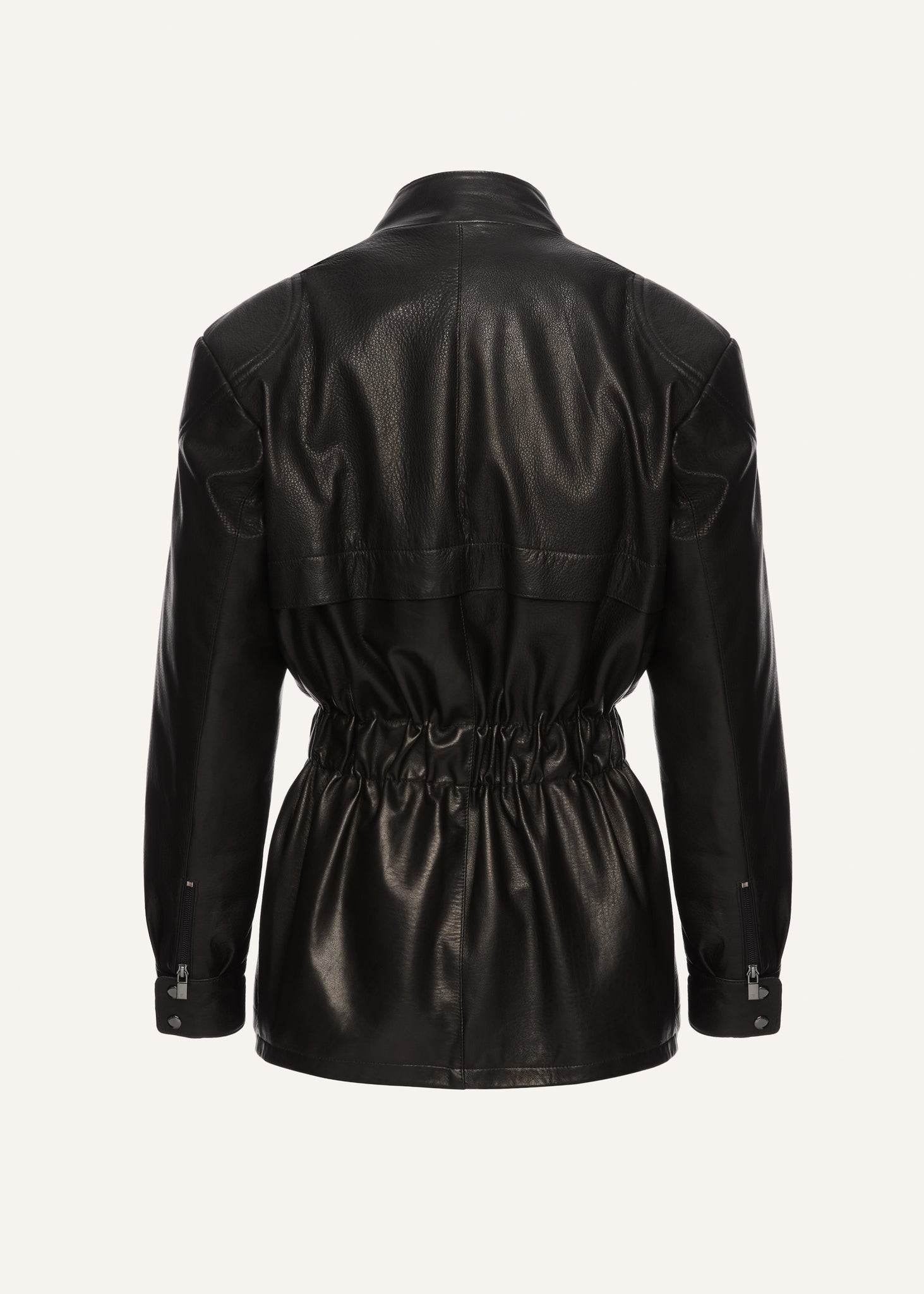 A structured utility-inspired silhouette with feminine definition, this jacket features a high snap-button collar, concealed front zipper, and contrast snap closures. A gathered waist with an additional belt detail cinches the shape, while flap pockets at the chest and vertical welt pockets at the hips add functional appeal.