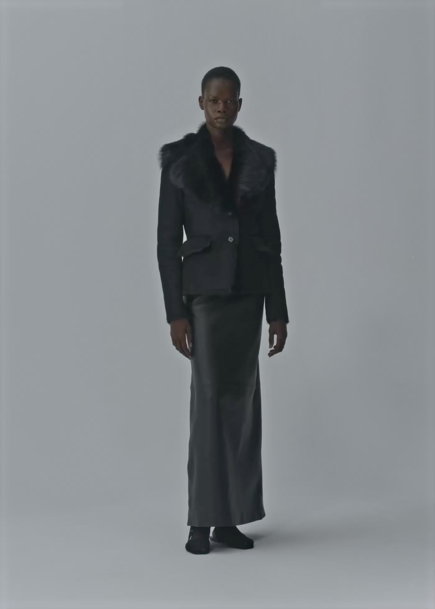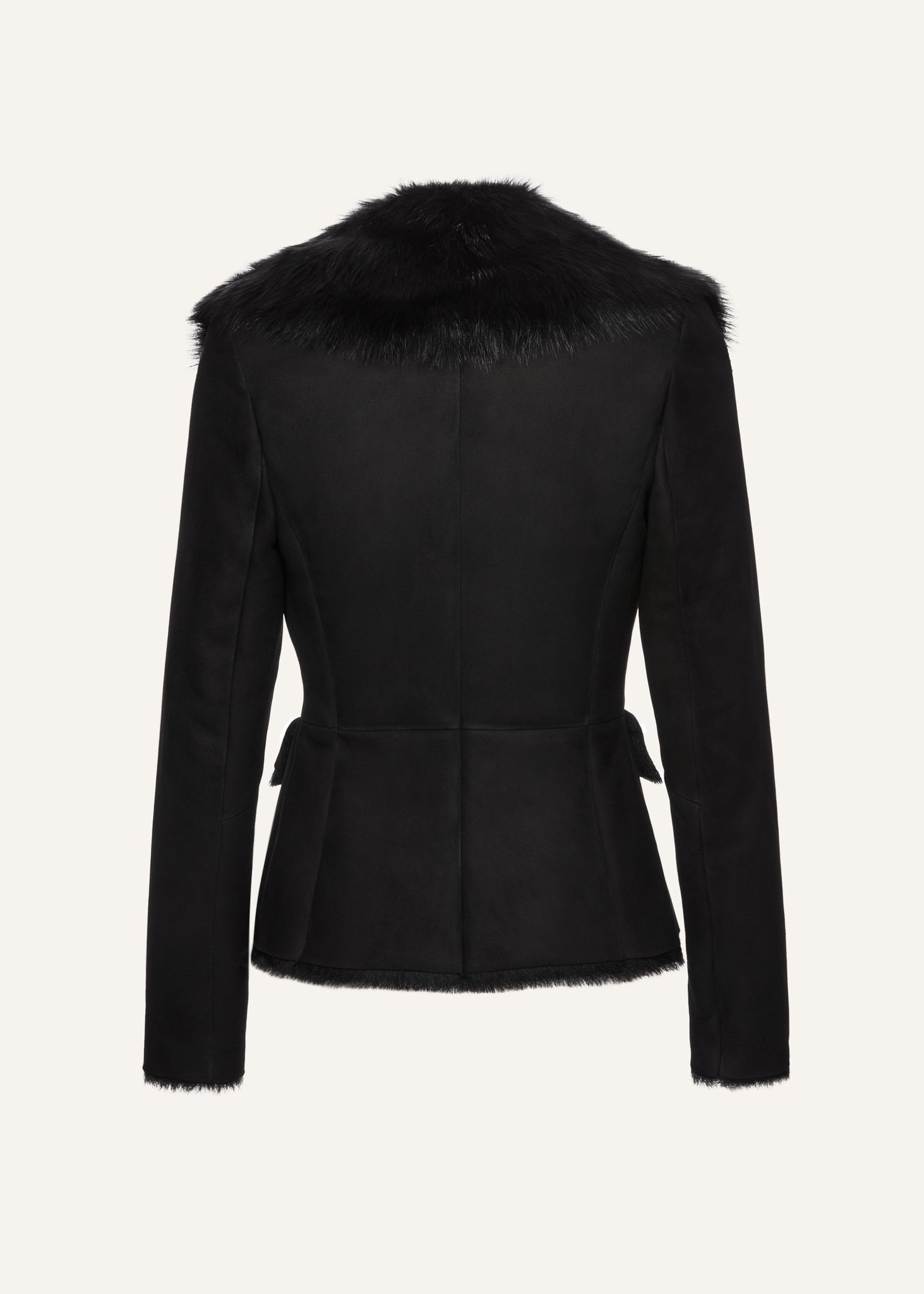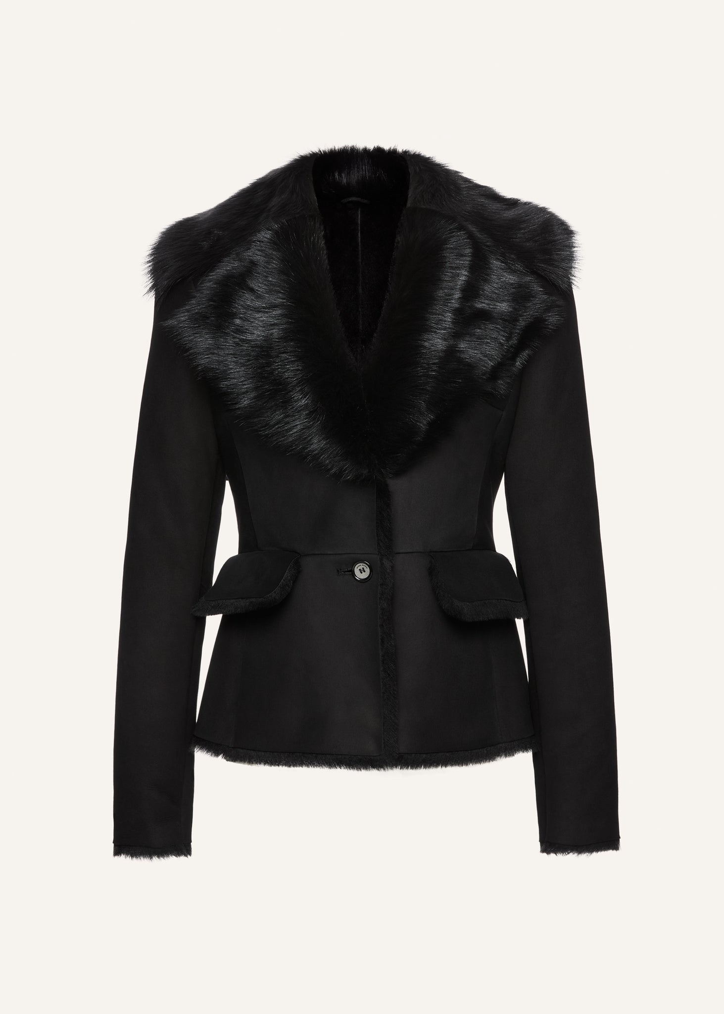 Fitted shearling blazer an exaggerated fur collar. Designed to frame the body with a tailored shape, finished with flap pockets and tonal fur-trimmed edges.