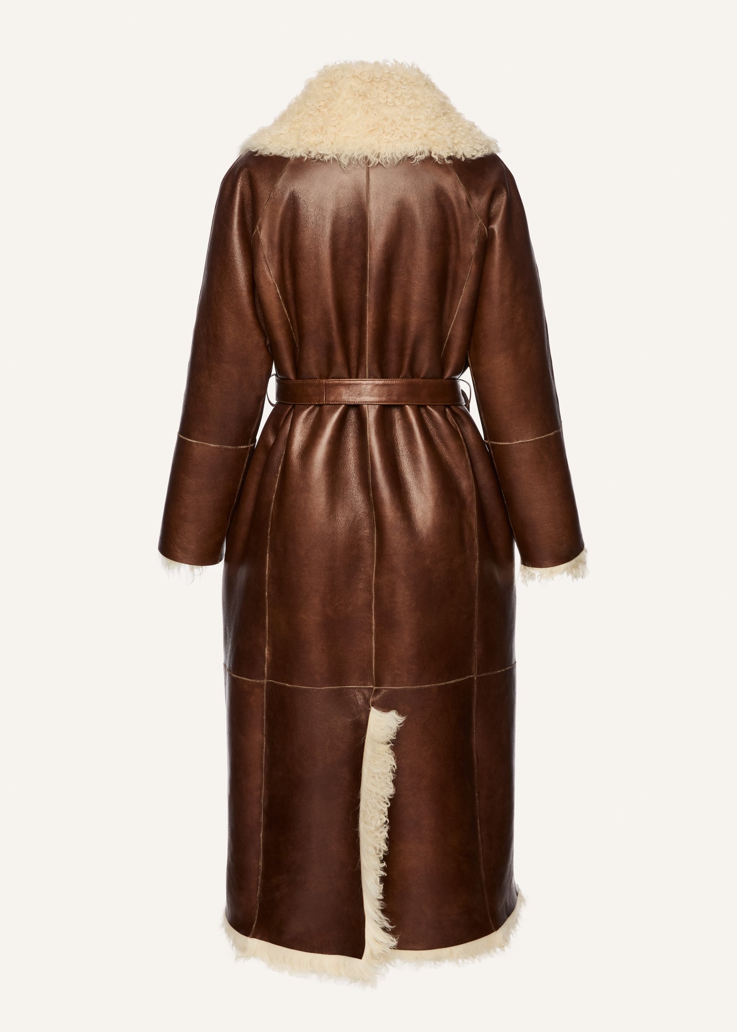 A full-length shearling coat crafted from rich brown leather with a soft cream interior. The sculptural silhouette features a dramatic shawl collar lined with plush curly shearling, extending through the lapel and hem for a bold contrast in texture. Designed with a matching leather belt to cinch the waist.