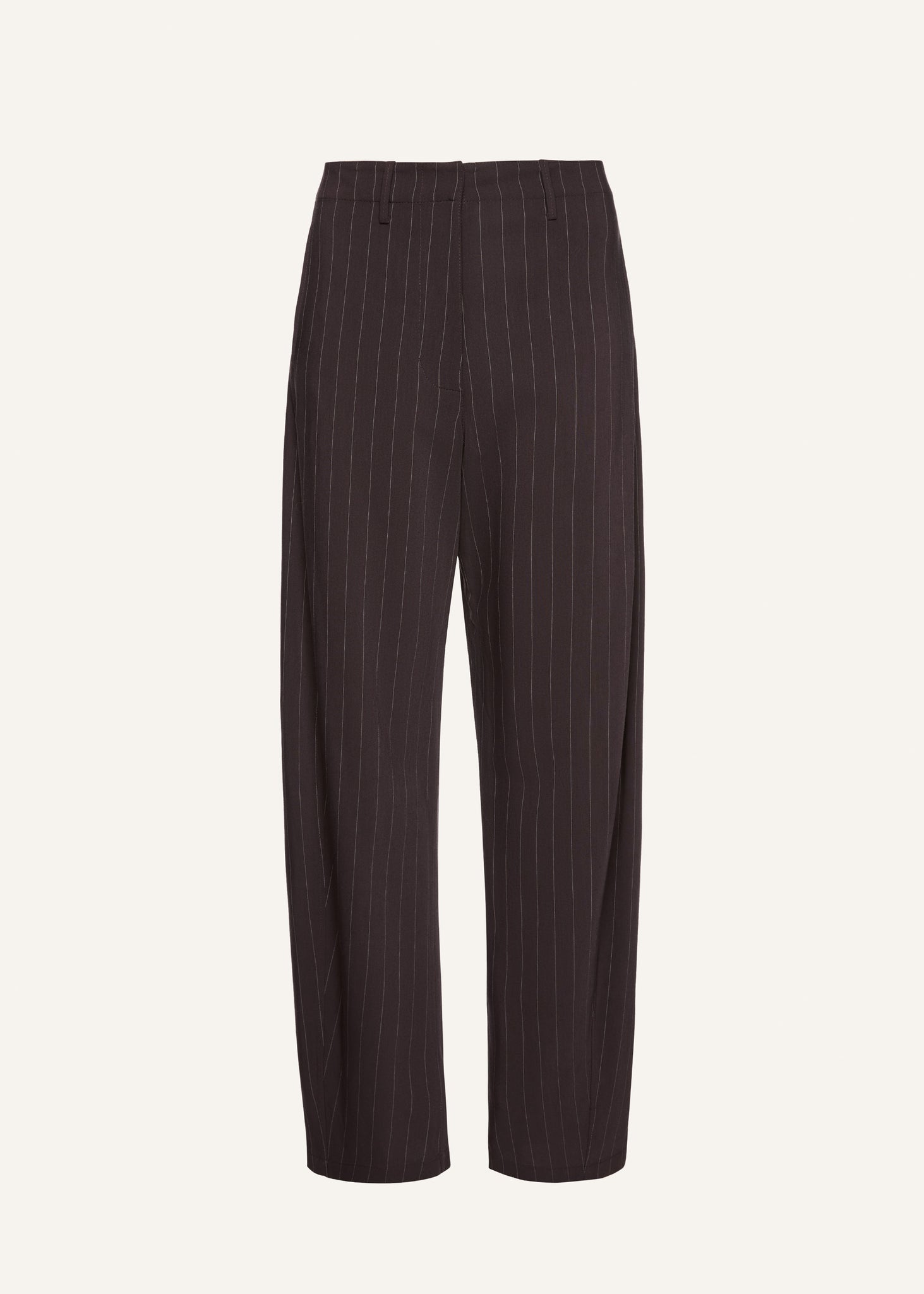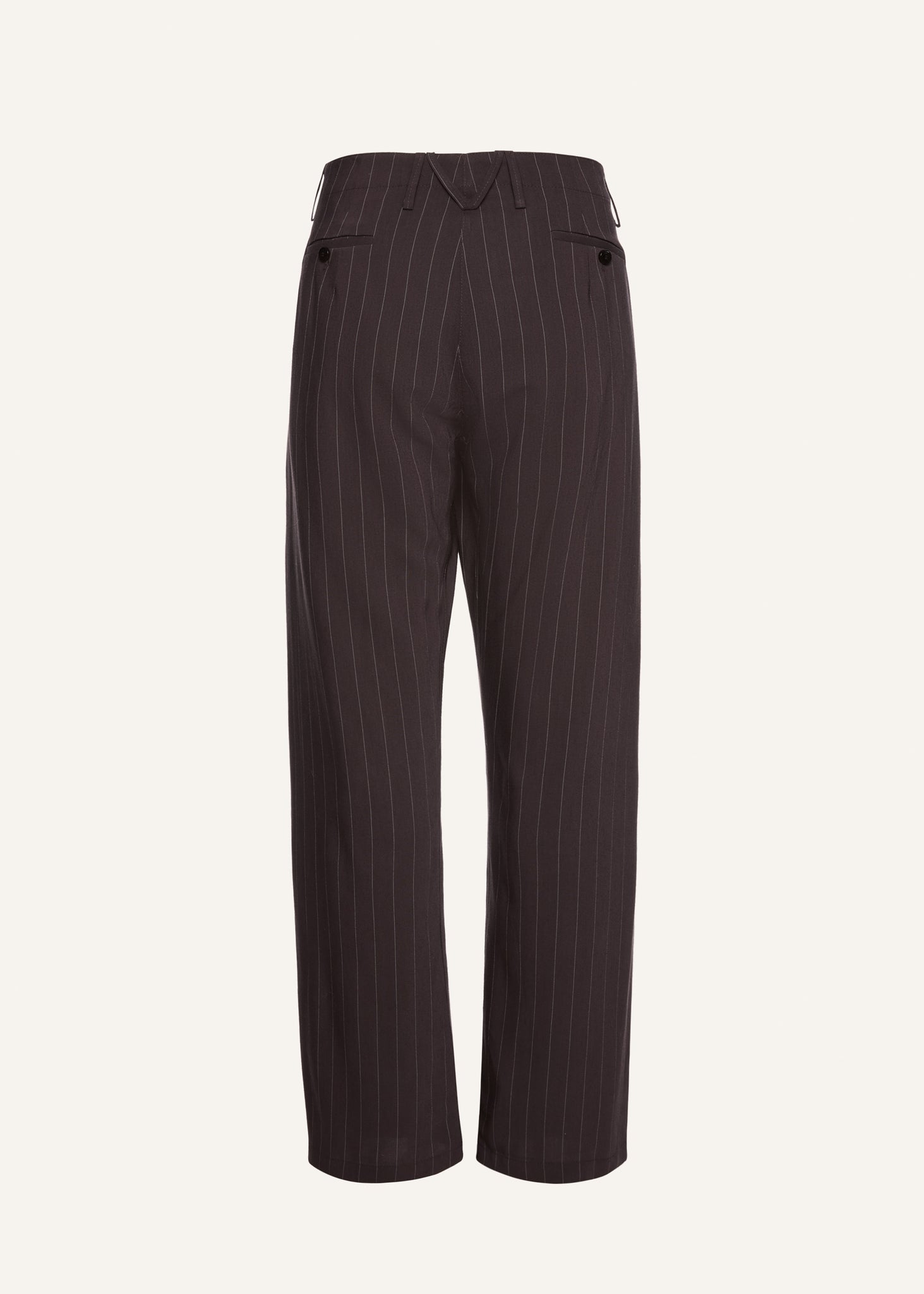 These tailored trousers feature a wide-leg silhouette with side seams shifted toward the front, creating a refined shape. Designed with front welt pockets and single-button back pockets, they have a dropped waistline. The rear belt loops are shaped into an "M" motif for a signature finish.
