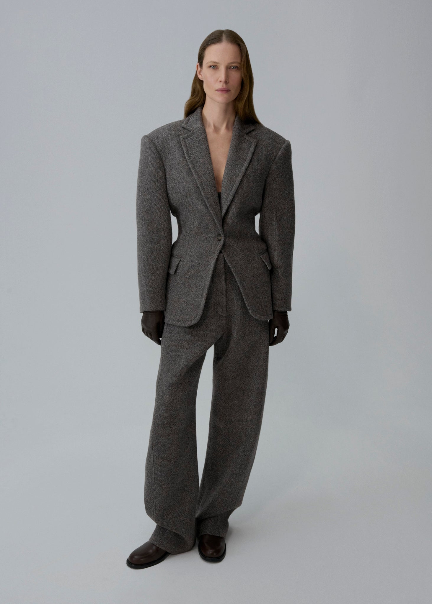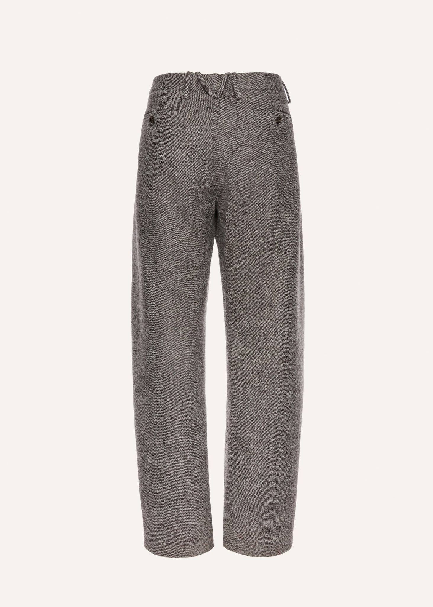 These tailored trousers feature a wide-leg silhouette with side seams shifted toward the front, creating a refined shape. Designed with front welt pockets and single-button back pockets, they have a dropped waistline. The rear belt loops are shaped into an "M" motif for a signature finish.