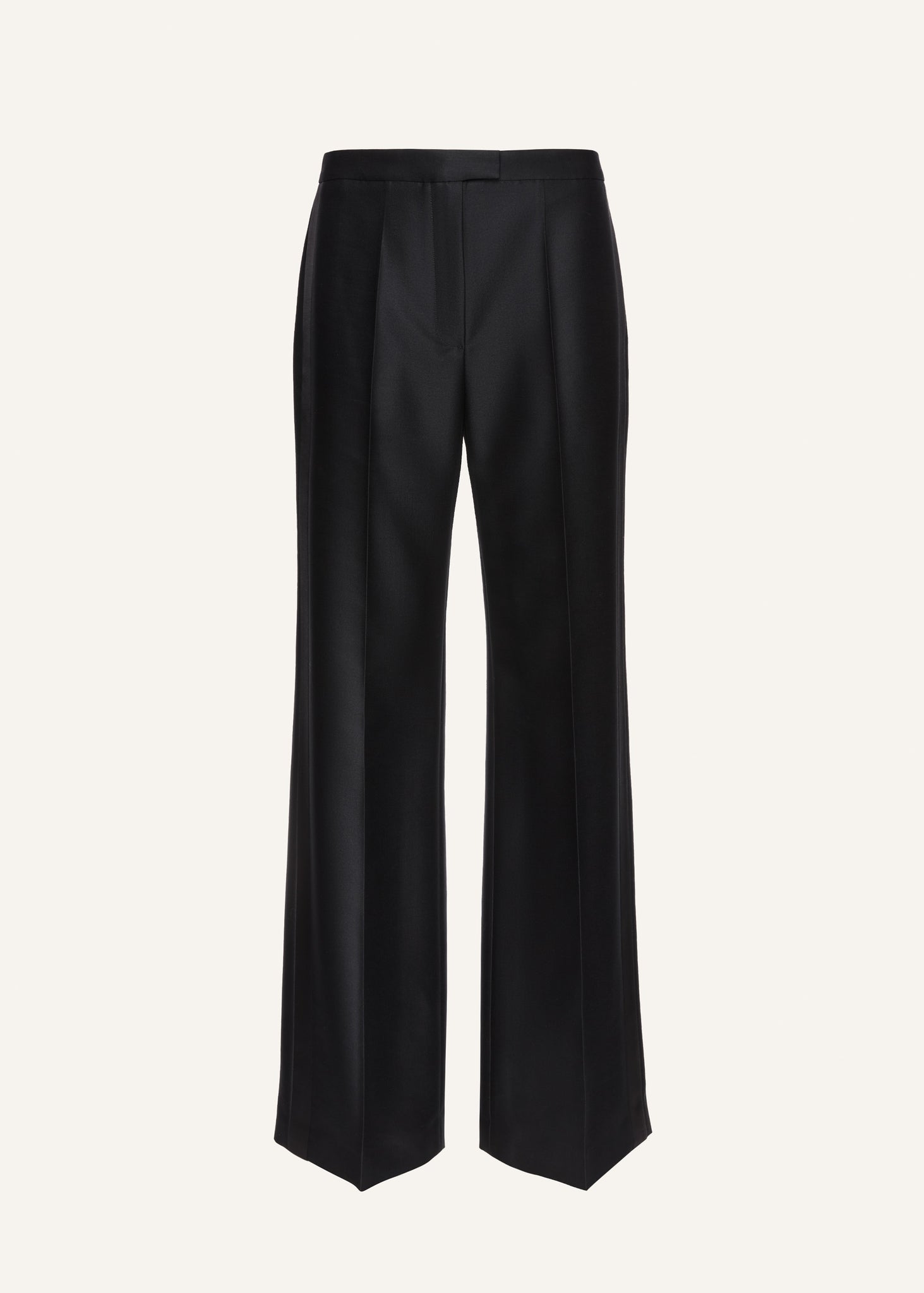 Tailored from wool and silk blend, these straight-leg trousers feature crisp front and back creases, enhanced by tonal side tuxedo stripes. The clean silhouette is complemented by discreet side seam pockets and back welt pockets with button closures.