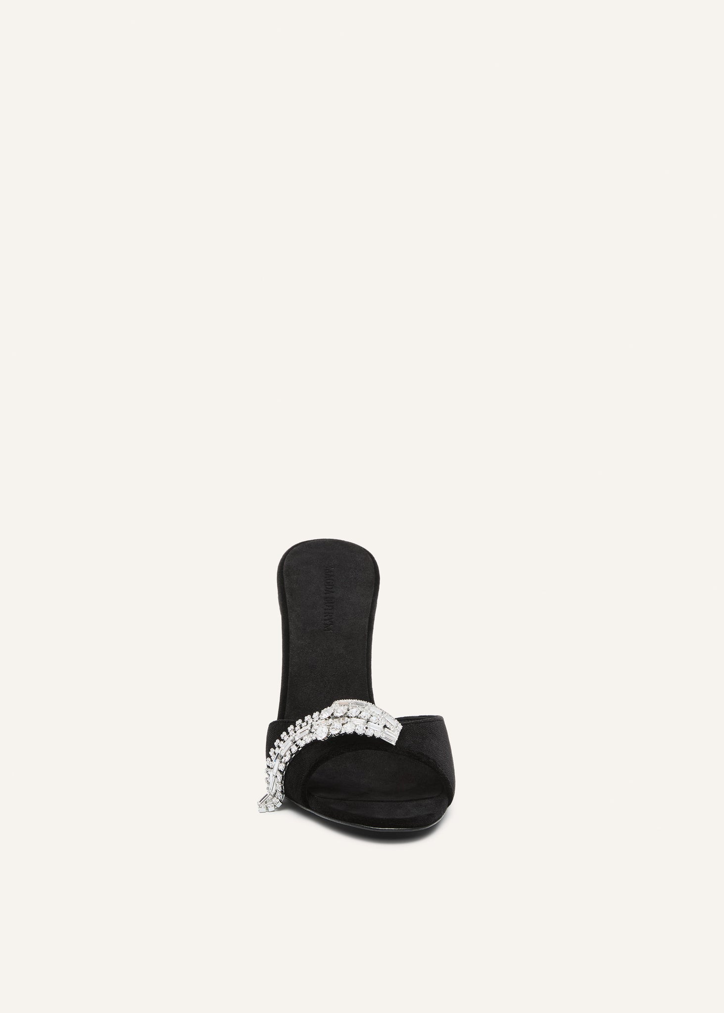 These sculptural mules feature a curved heel and open toe silhouette for a bold, feminine profile. A crystal-encrusted buckle at the strap cascades into strands of rhinestone fringe, adding movement and sparkle with every step. Made in Italy, this glamorous design is a standout accessory for evening wear or statement day looks. Heel height is 10 cm.