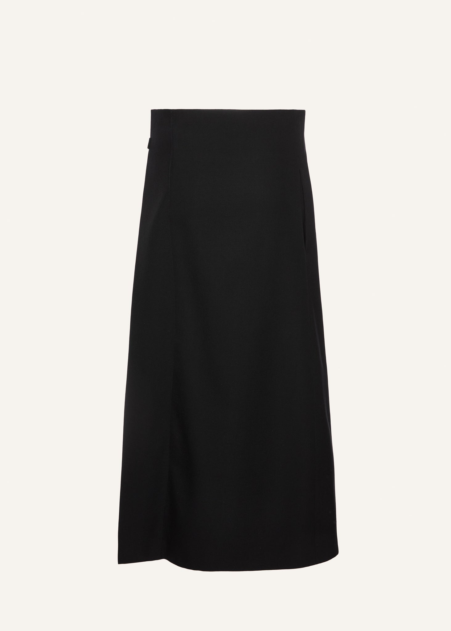 Wrap-style long skirt secured with two buttons and an adjustable waistband on the left side with an additional button closure. Includes a side seam pocket on the right and is fully lined in silk.