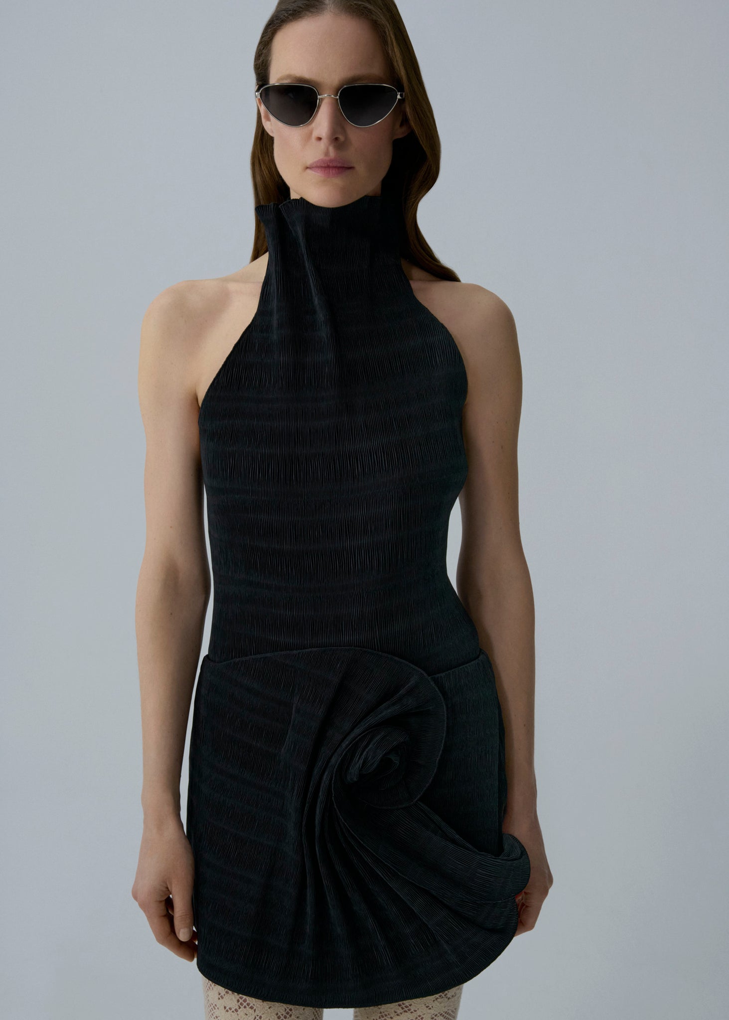 MIni skirt designed with a lowered waistline and a standout draped floral appliqué at the front. Features hidden zip closure at center back and discreet side seam pockets.