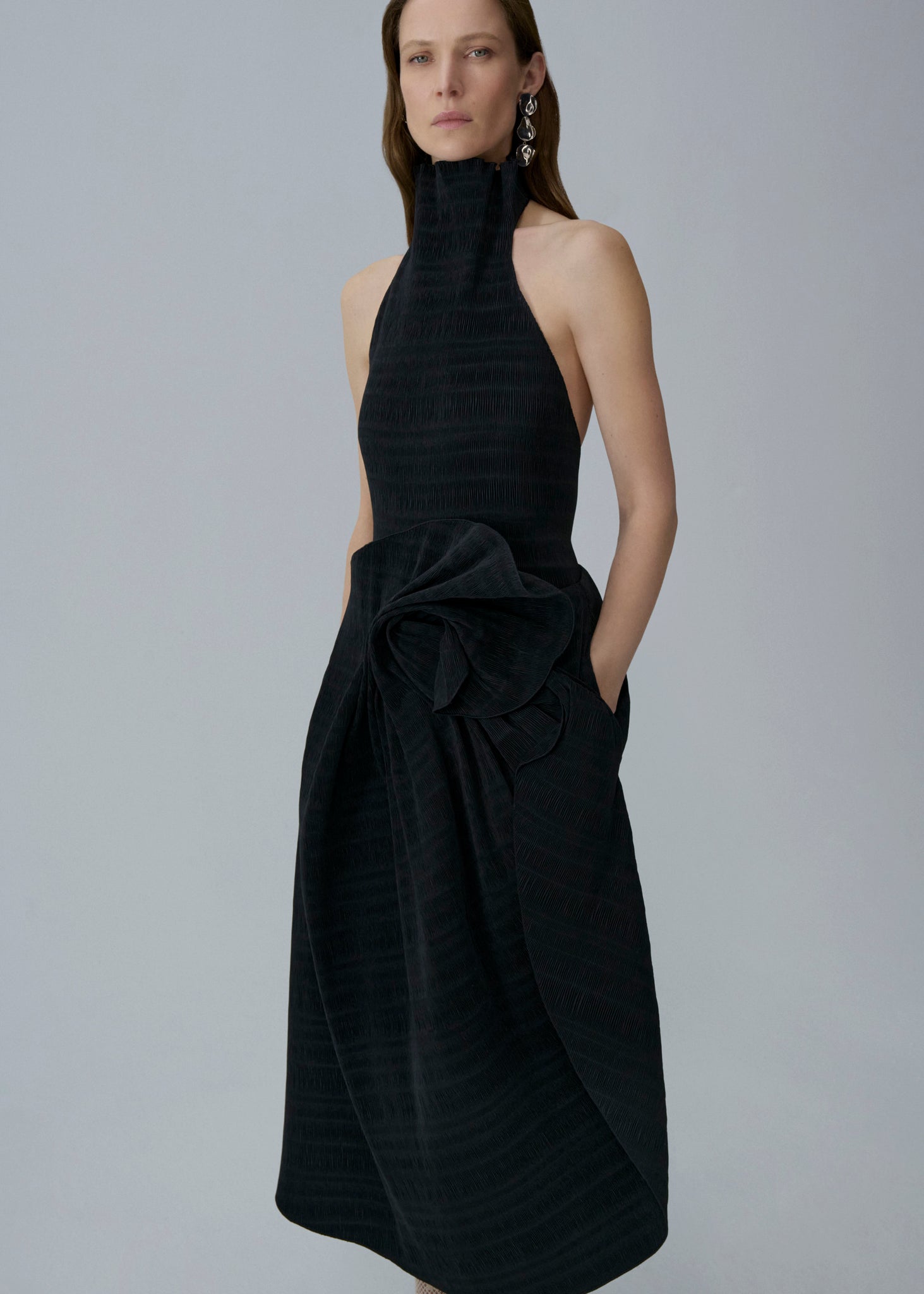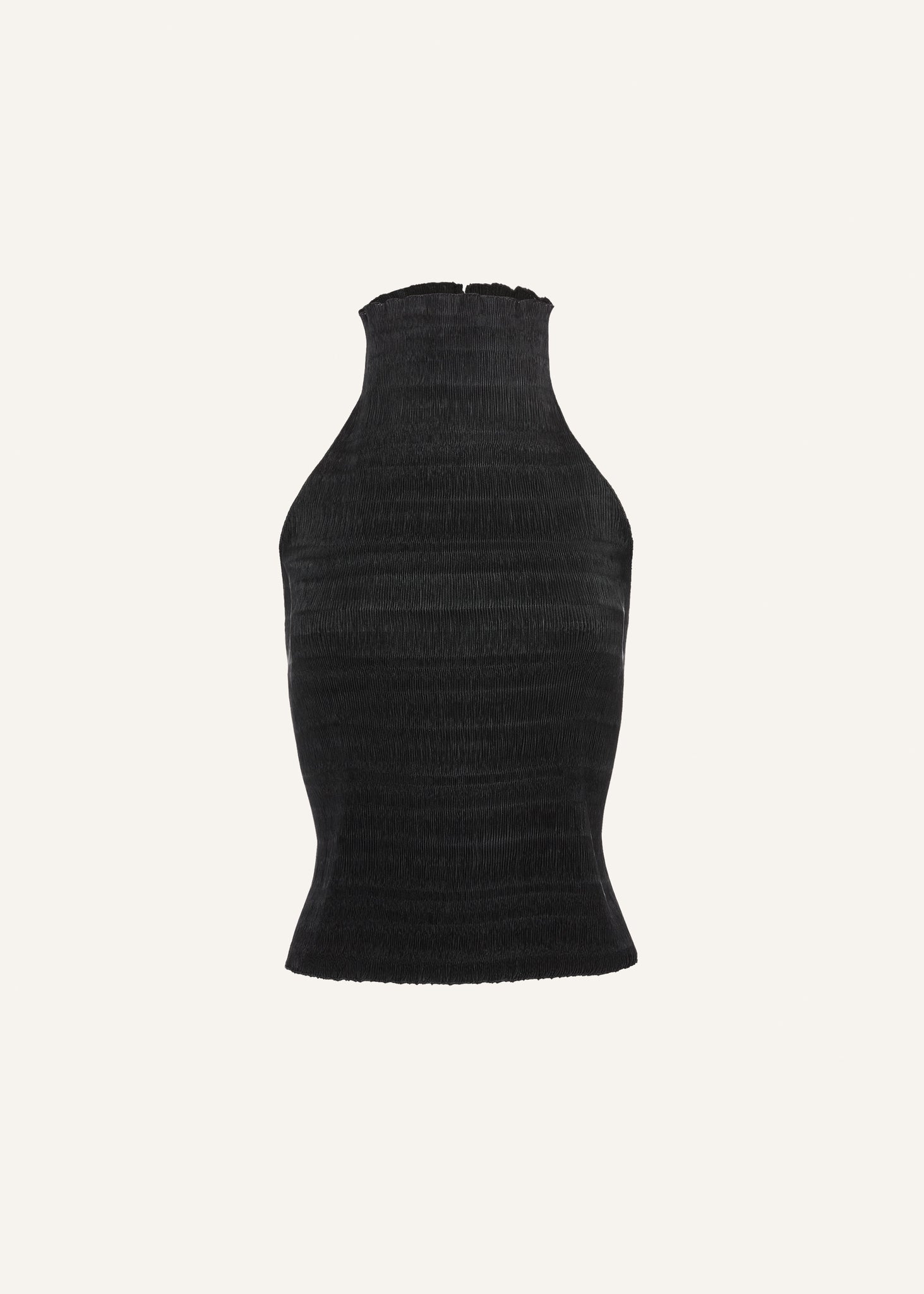 Halter top made from fine plissé fabric. It features an open back and a high neckline finished with a narrow stand collar. The collar fastens at the back with fabric-covered buttons. Designed to be slipped on over the head, this piece offers a sleek silhouette with rich texture and modern minimalism.