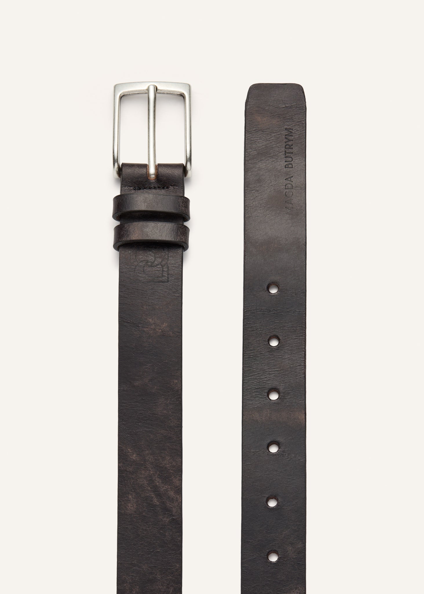 A sleek and versatile burgundy leather belt, distinguished by its silver-tone buckle and embossed brand logo detail. Crafted from premium leather with a vintage finish.