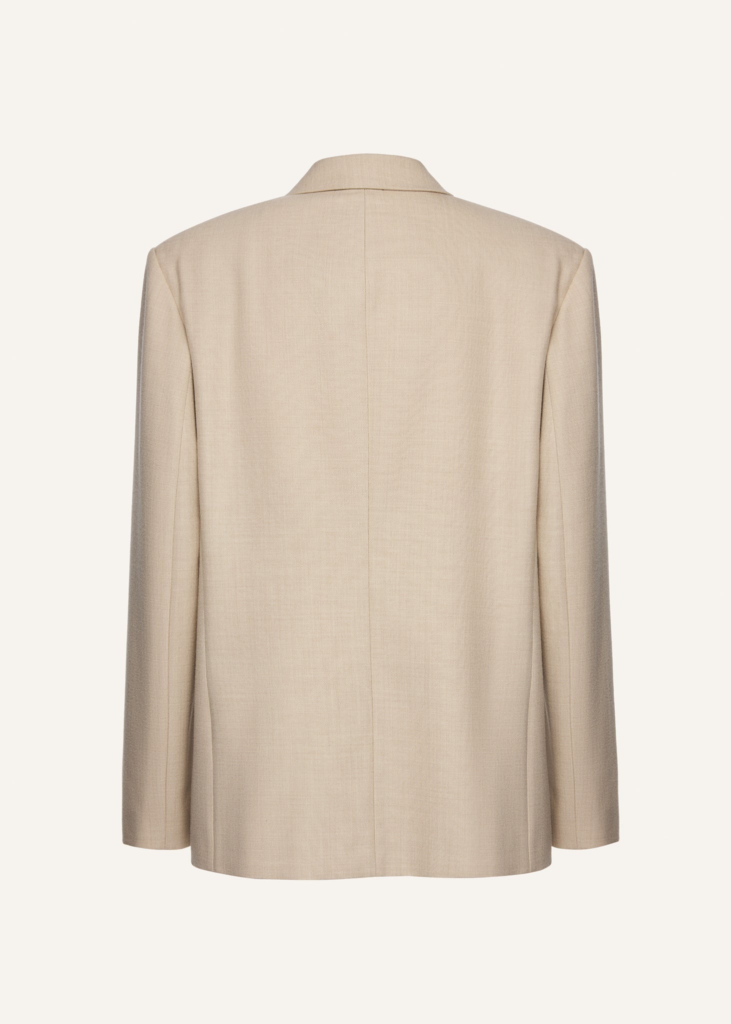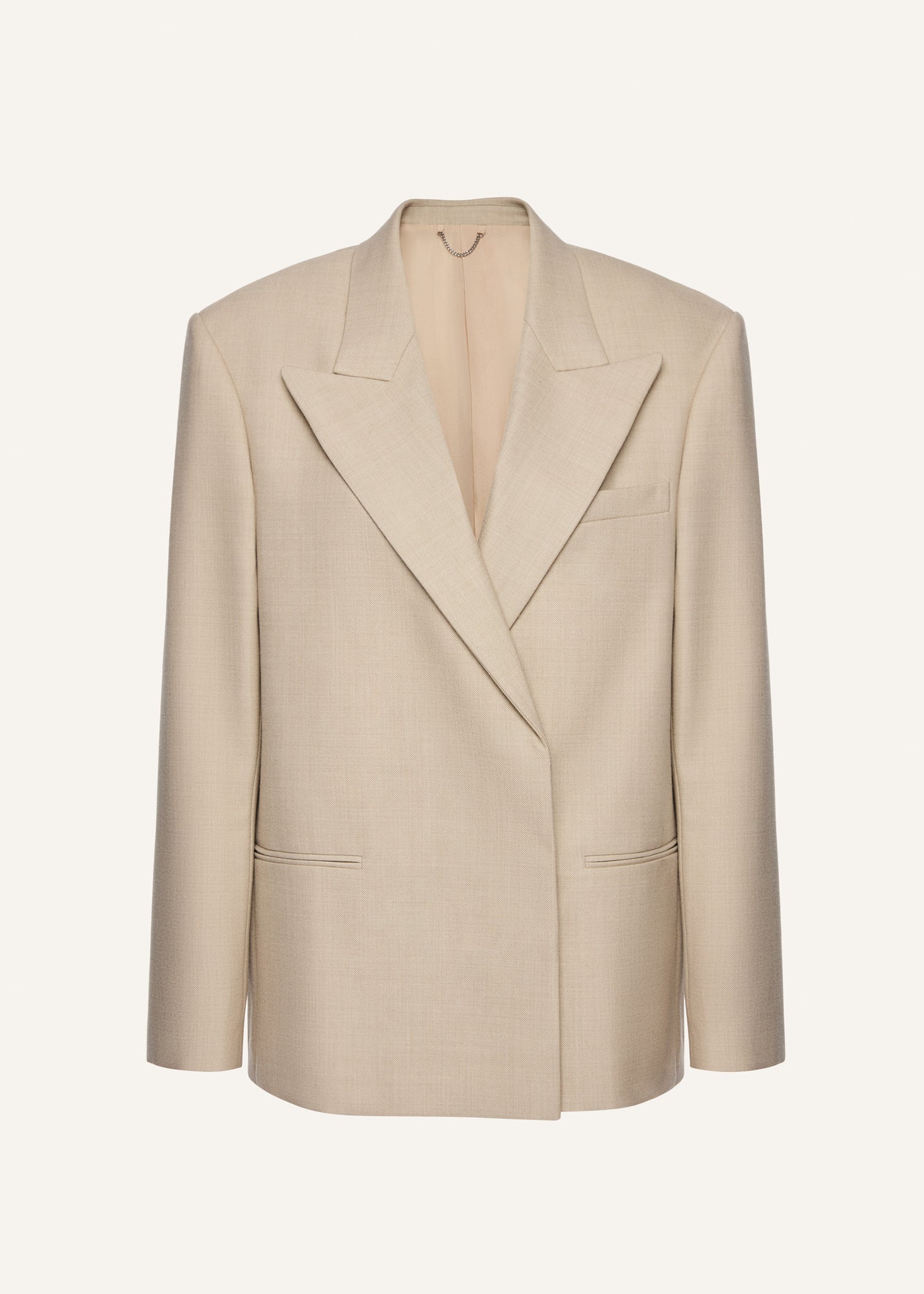 An oversized wool blazer with a modern crossover, buttonless fit and classic lapels.