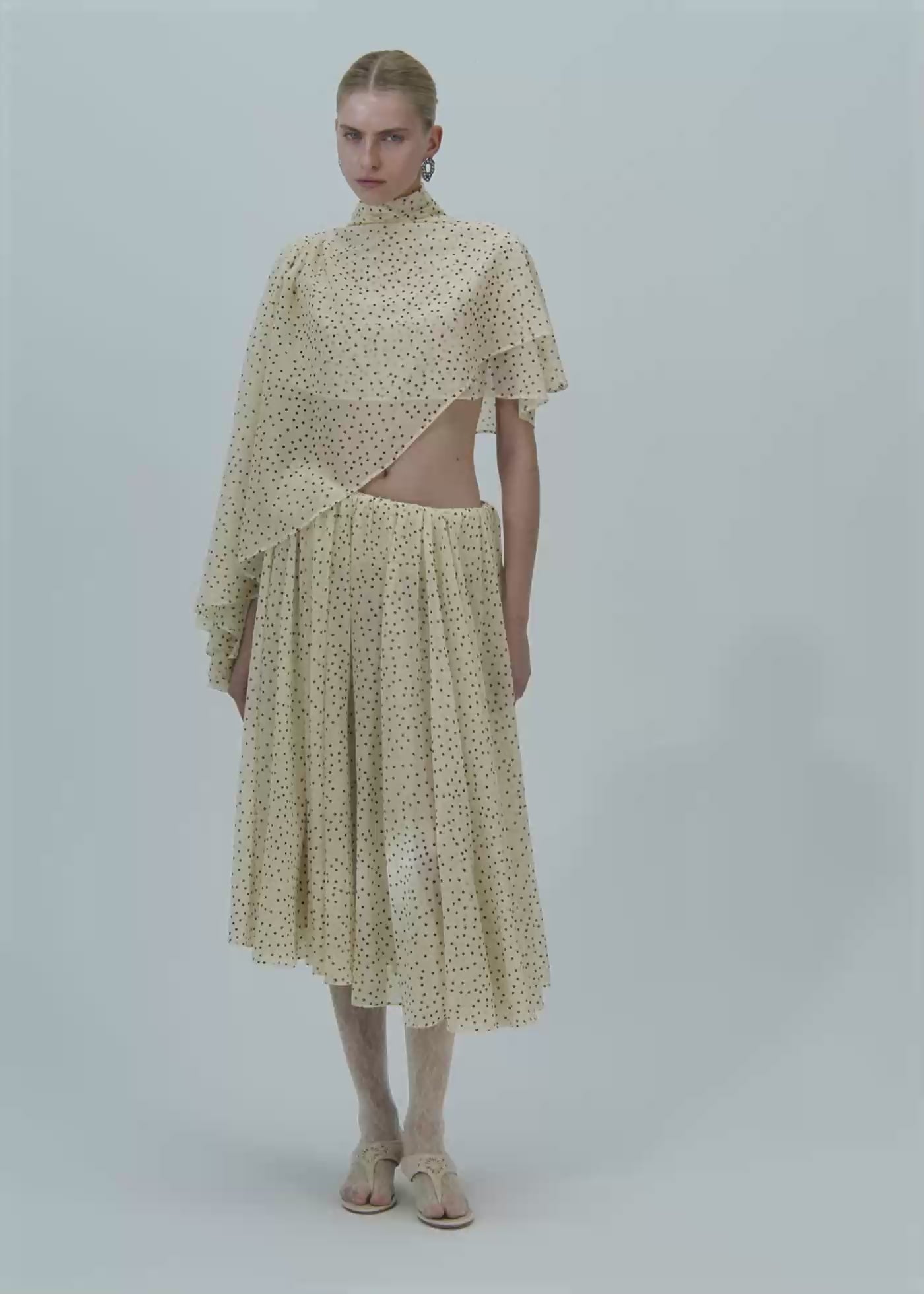 Crafted from layers of sheer silk, this high-neck blouse has an asymmetrical cropped hemline with flowing sleeves and body for a romantic look.