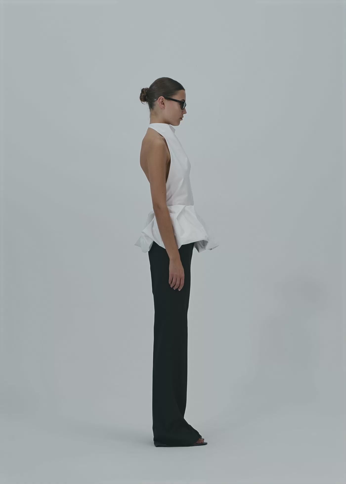 A sleeveless halter neck top made from poplin cotton, with a flared peplum hem that starts from the waist and an open back.