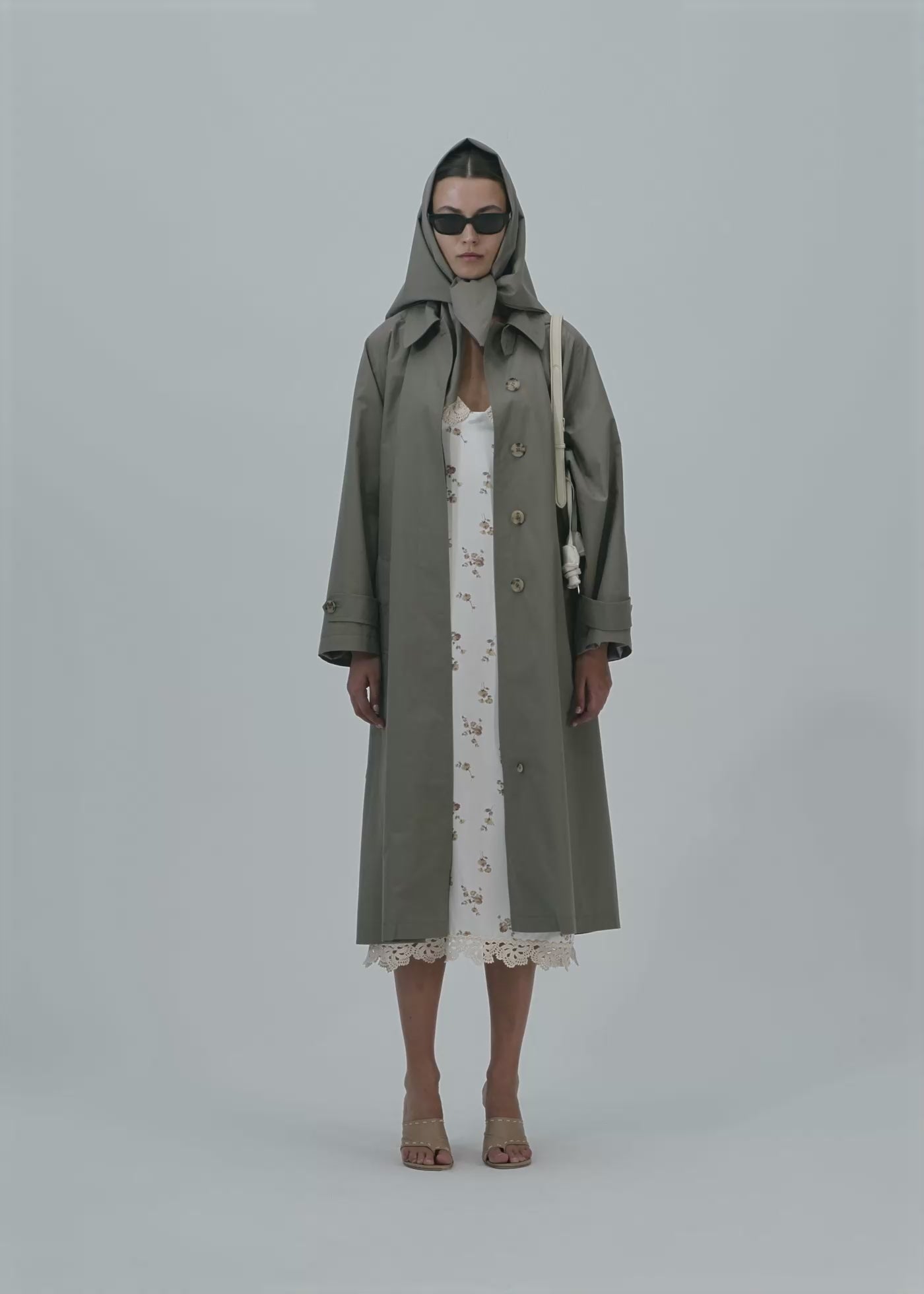 A lightweight cotton trench coat with a single button closure at the neck, classic folded collar, and belted waist closure. Comes with a removable hood for a slavic inspired touch.