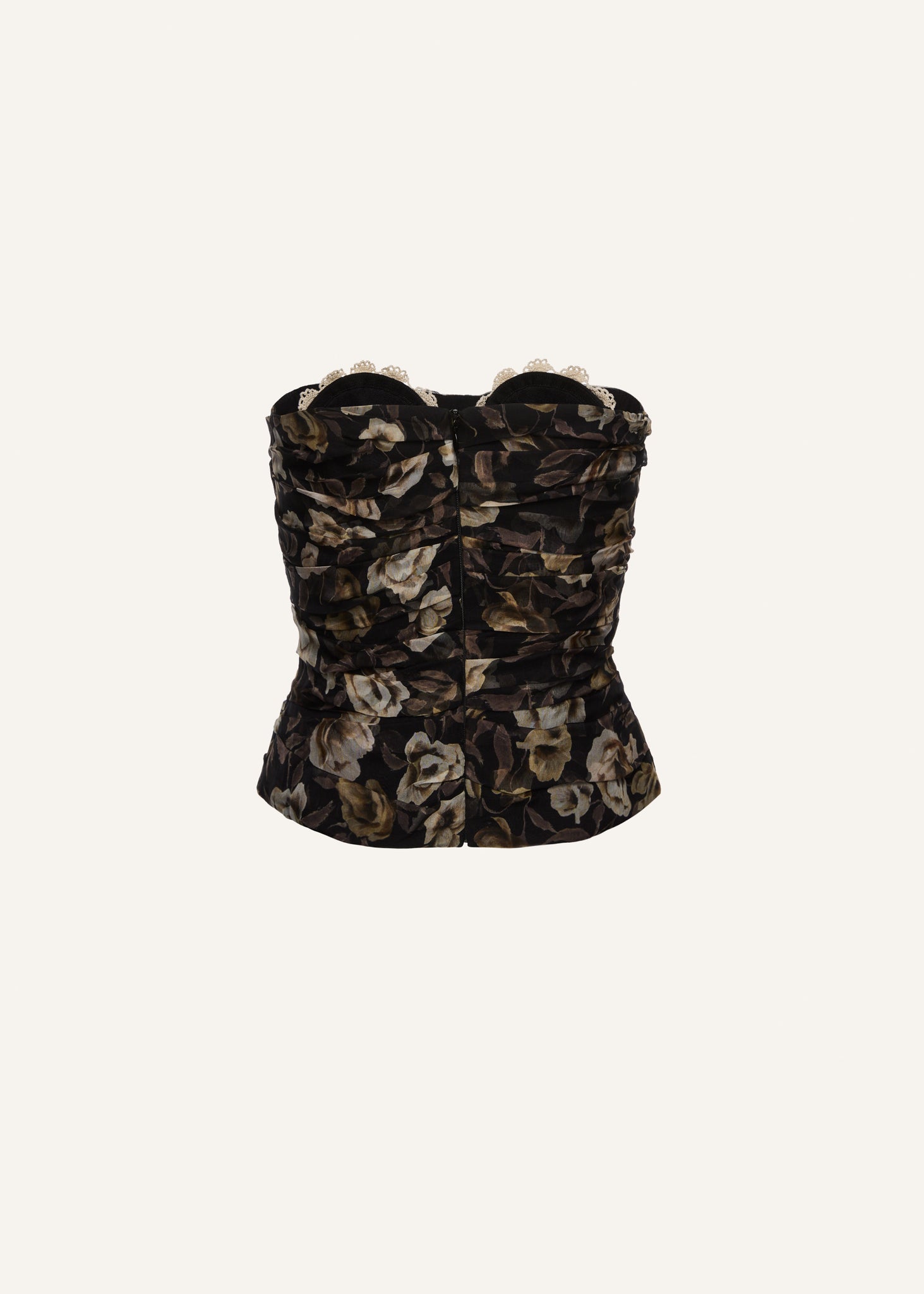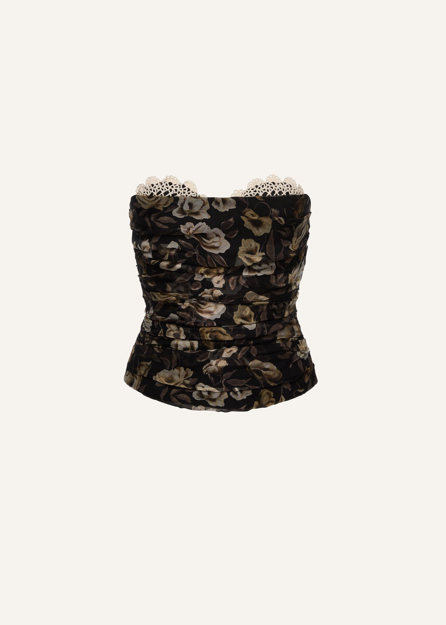 A silk strapless corset with all over ruching, with Maga's signature handmade lace crochet detailing at the neckline for a special touch.