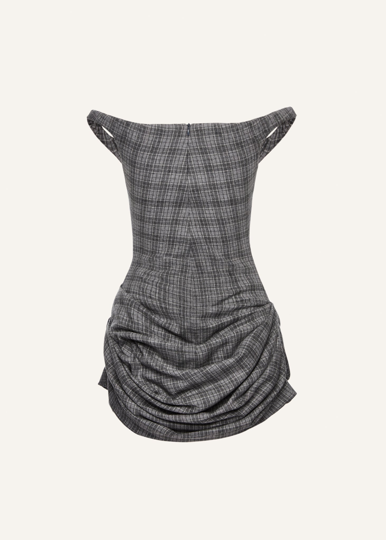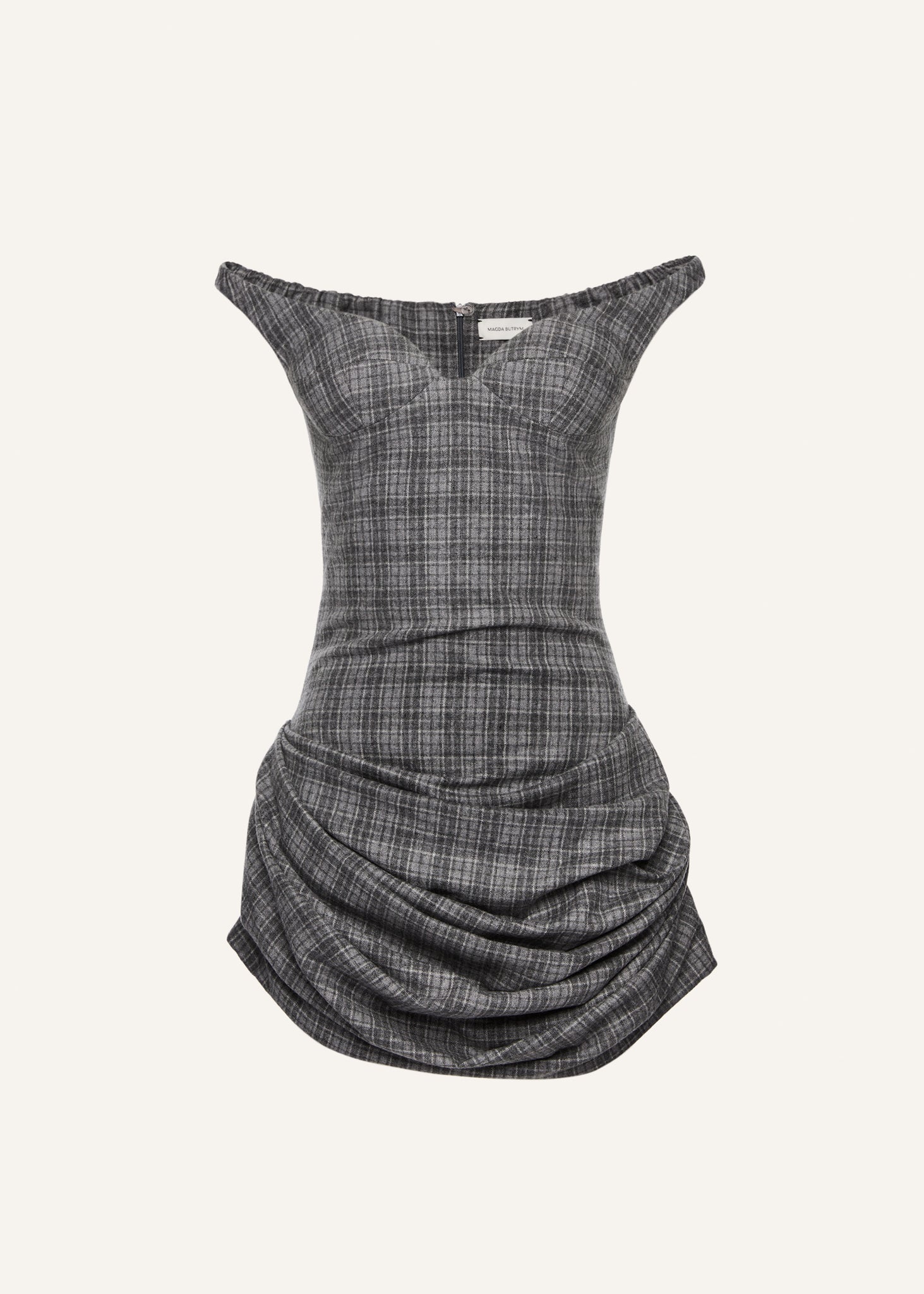 An off-shoulder bustier dress with a ruched mini skirt, made this season in wool.