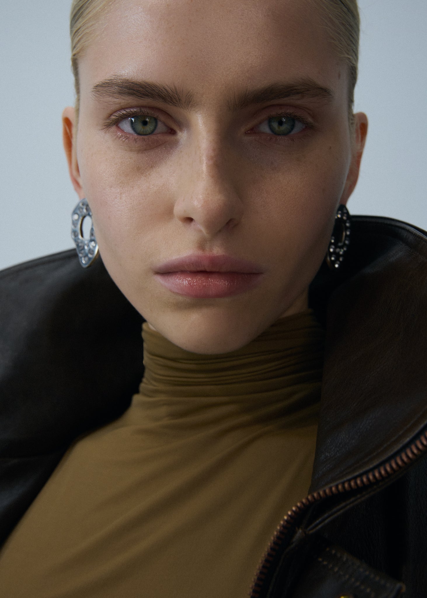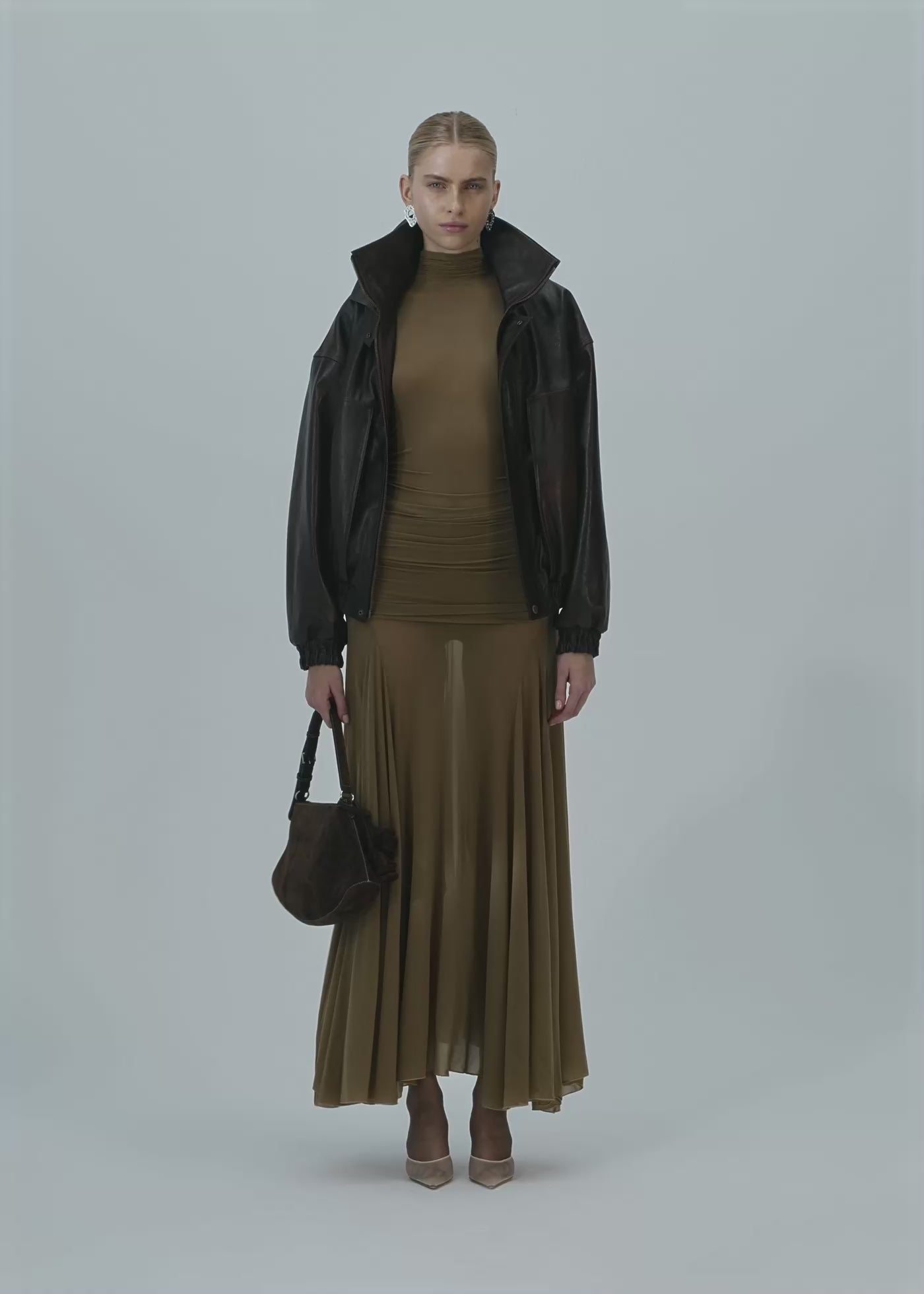 This sheer maxi dress has a fitted high-neck bodice and flowy midi skirt, complete with ruching at the waist to create an elongated drop-waist effect. Comes with an undergarment.