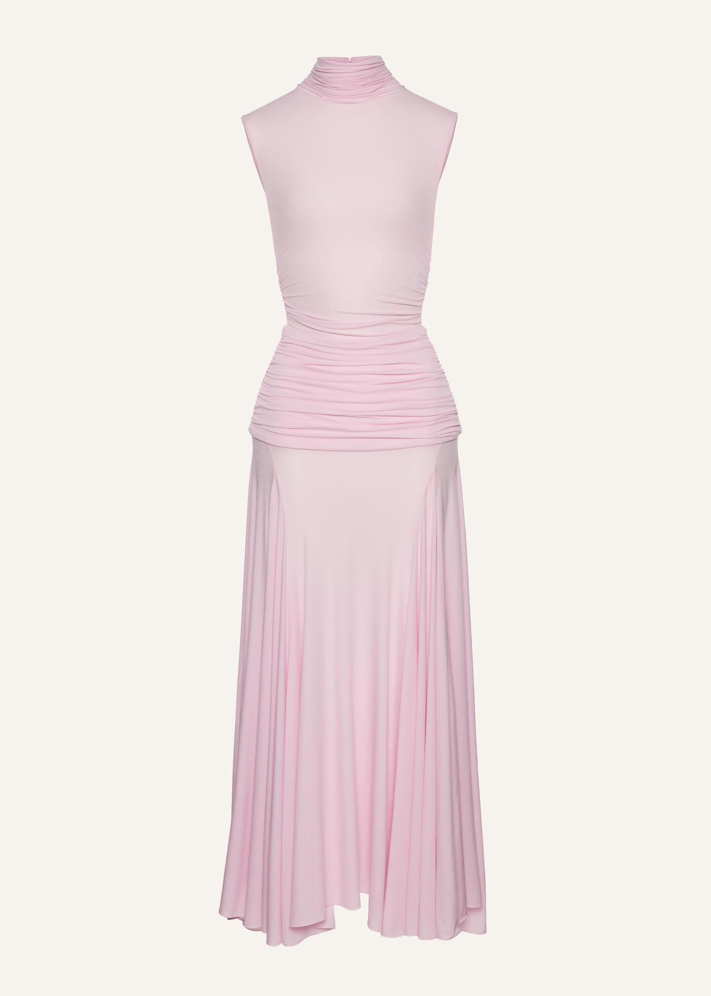 This sheer maxi dress has a fitted high-neck bodice and flowy midi skirt, complete with ruching at the waist to create an elongated drop-waist effect. Comes with an undergarment.