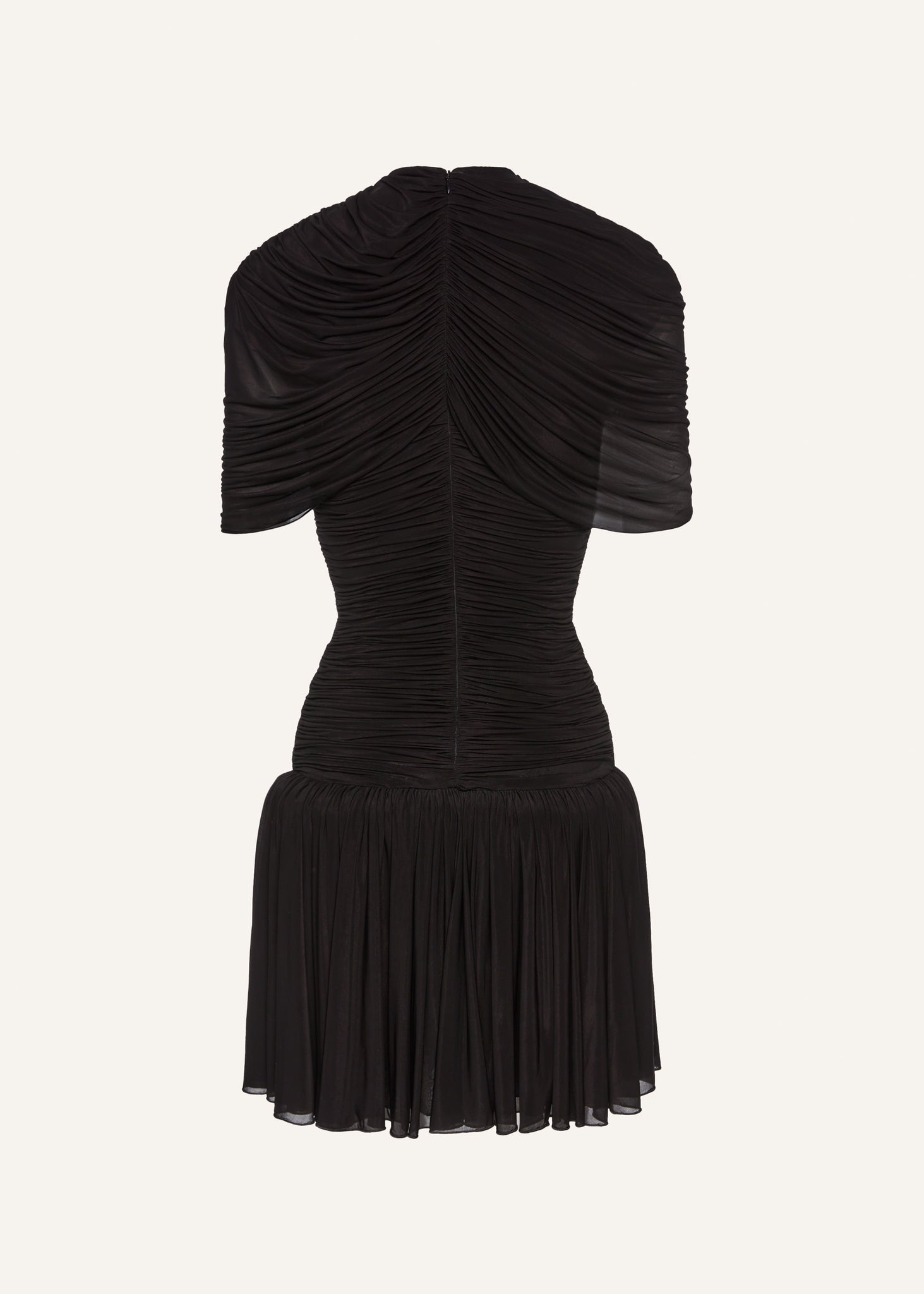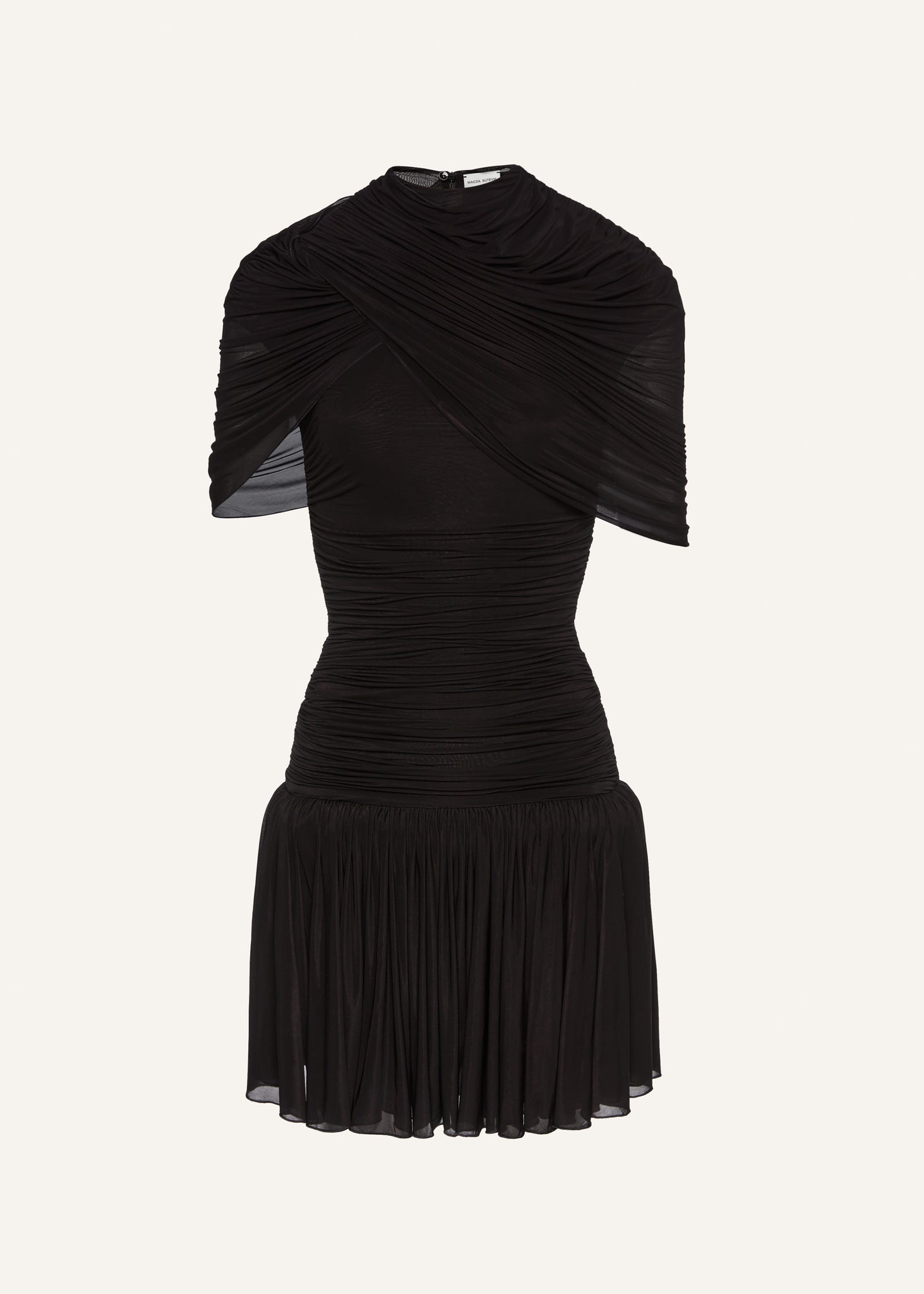 Swaths of sheer cupro fabric are meticulously wrapped and draped to create this special mini dress, with a fitted ruched bodice and wrap cape overlay, giving way to a drop-waist shirred skirt.