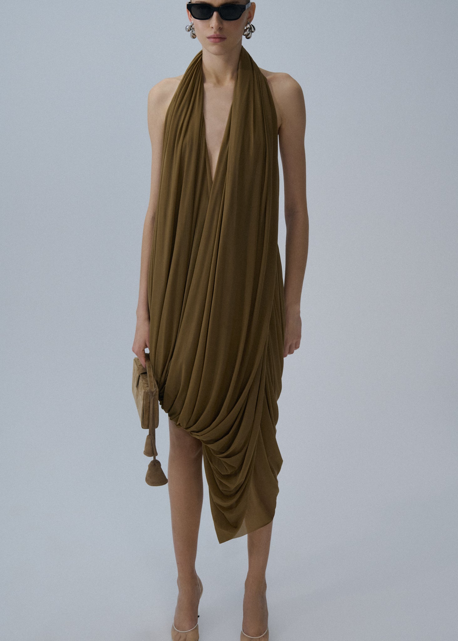 Swaths of sheer cupro fabric are draped across the body in ample quantities to create an asymmetrical halter dress with a billowing fit.