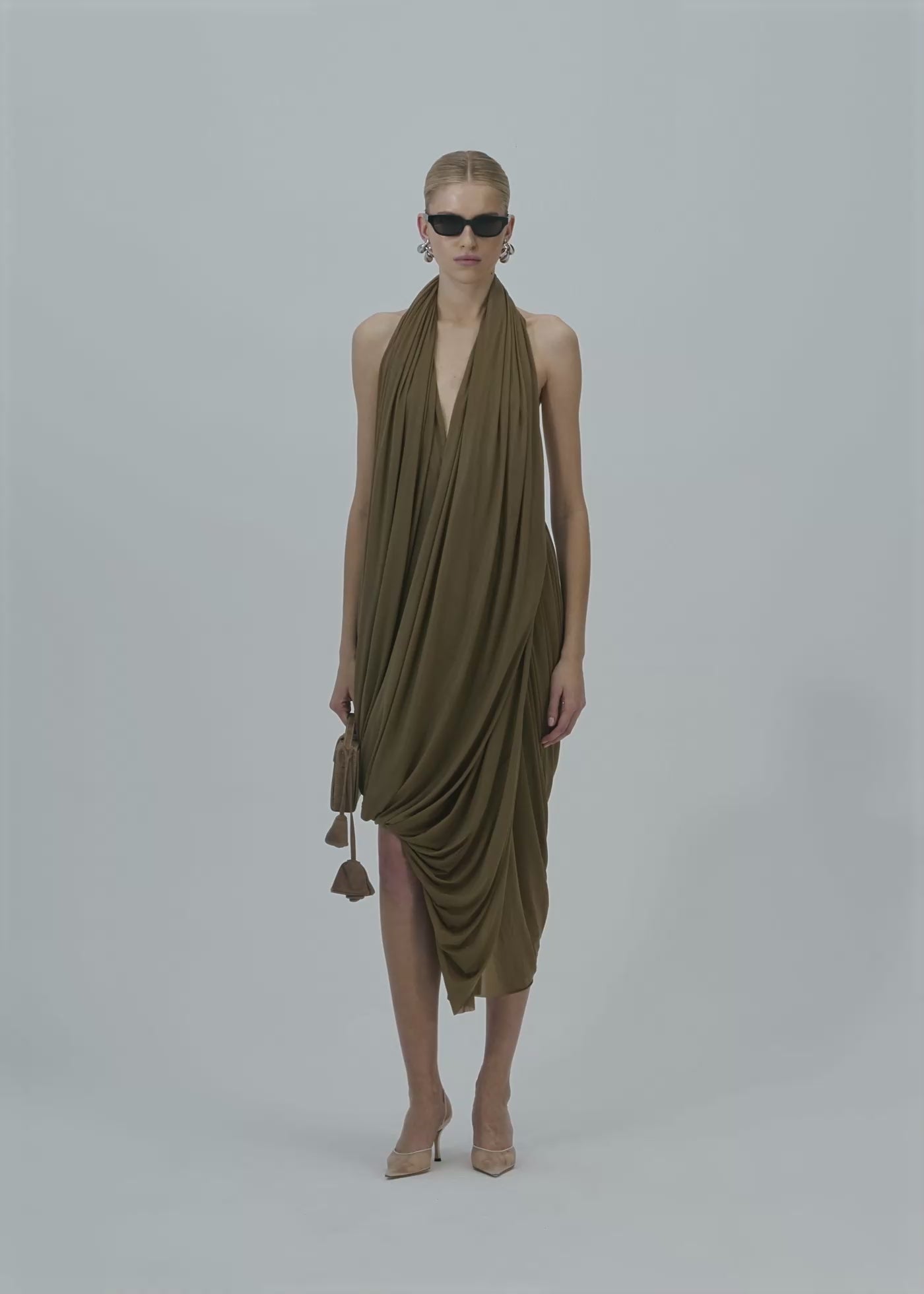 Swathed halter midi dress in beige