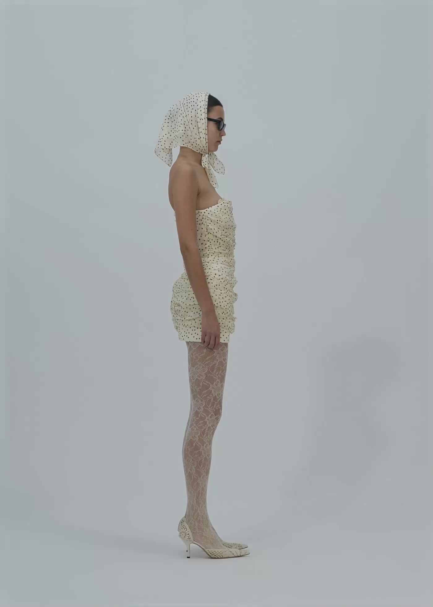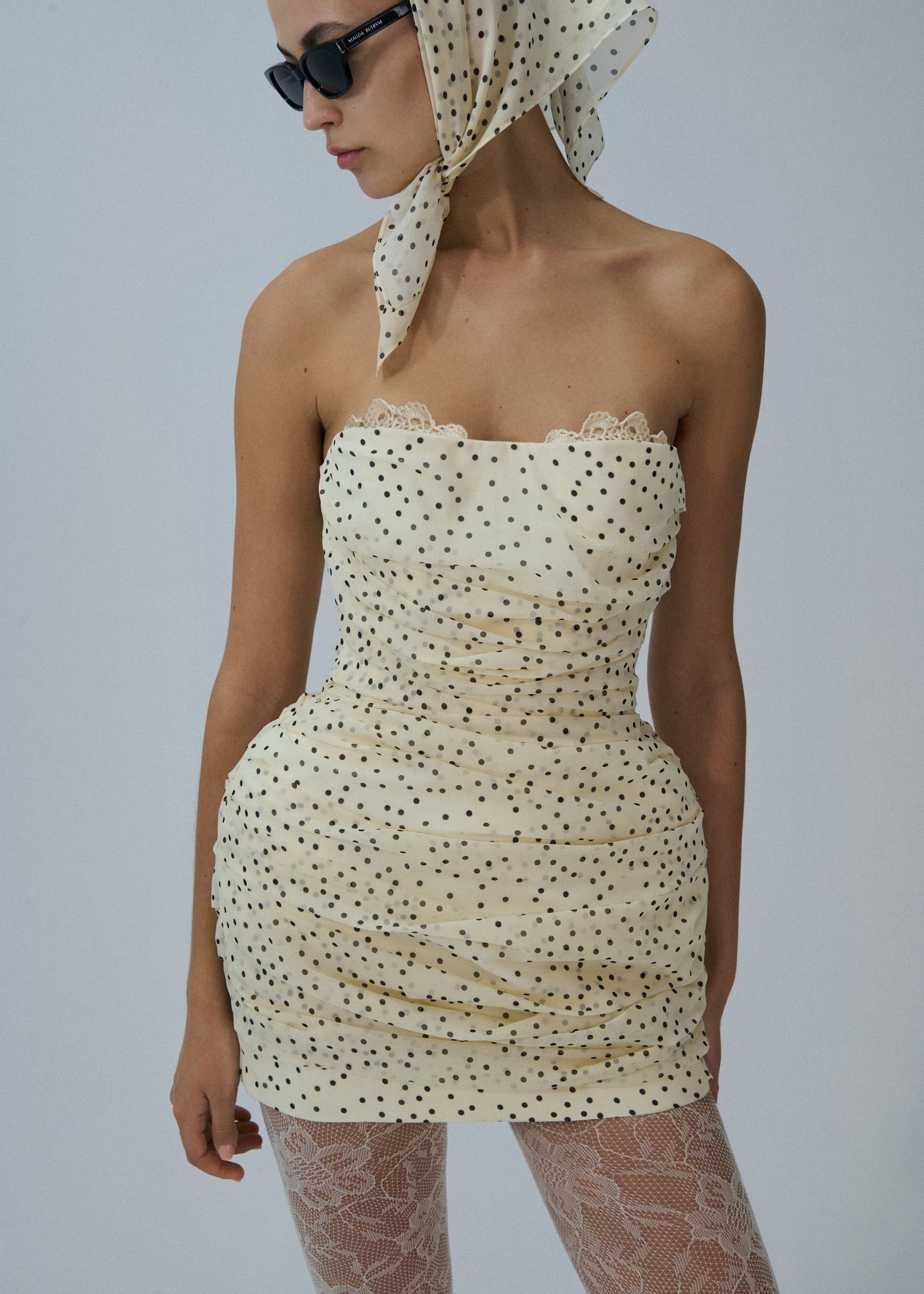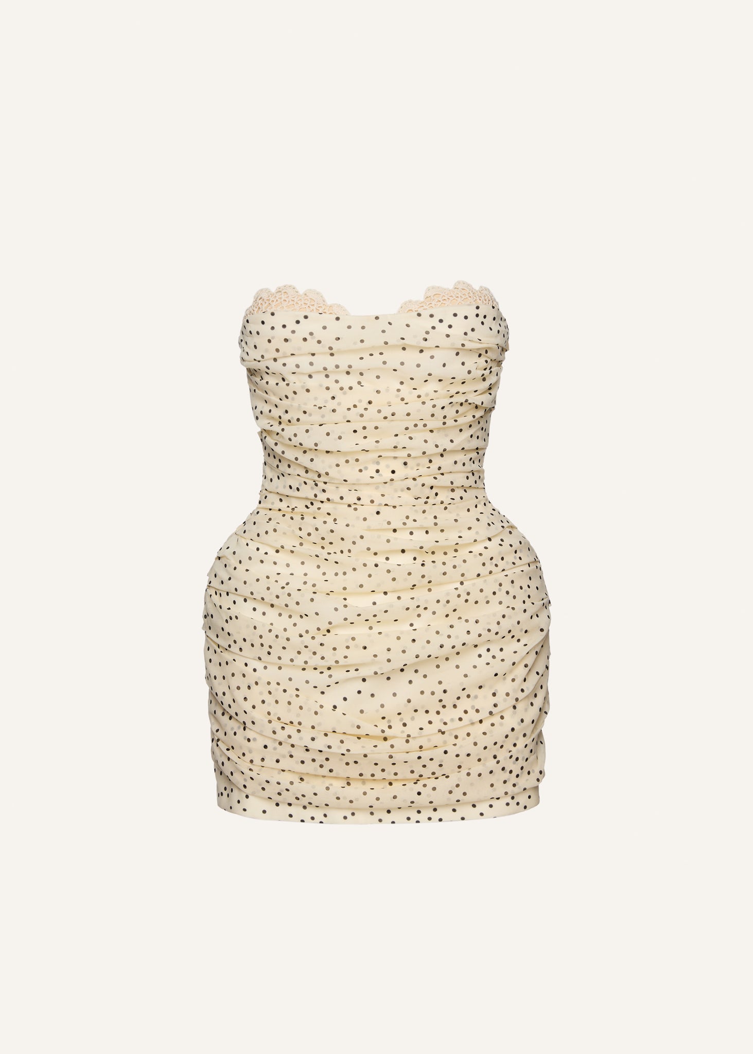 Strapless ruched silk mini dress in cream dots
