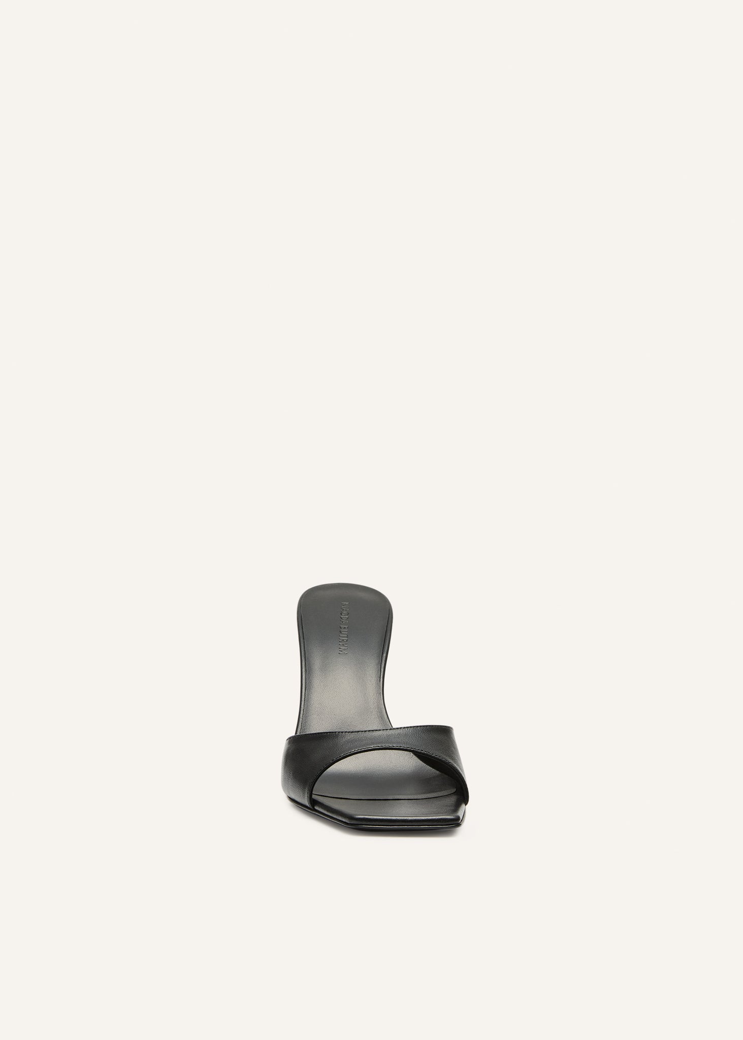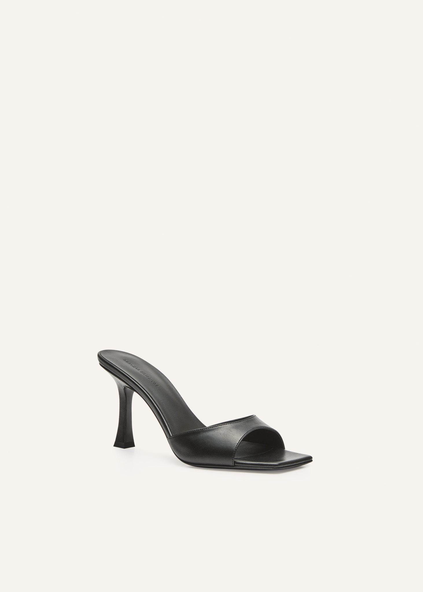 A pair of Italian-made mule sandals with a thinner leather strap and a square toe box, set atop a 10,5cm heel designed to be slightly flared for a modern look, crafted with a leather lining and sole.
