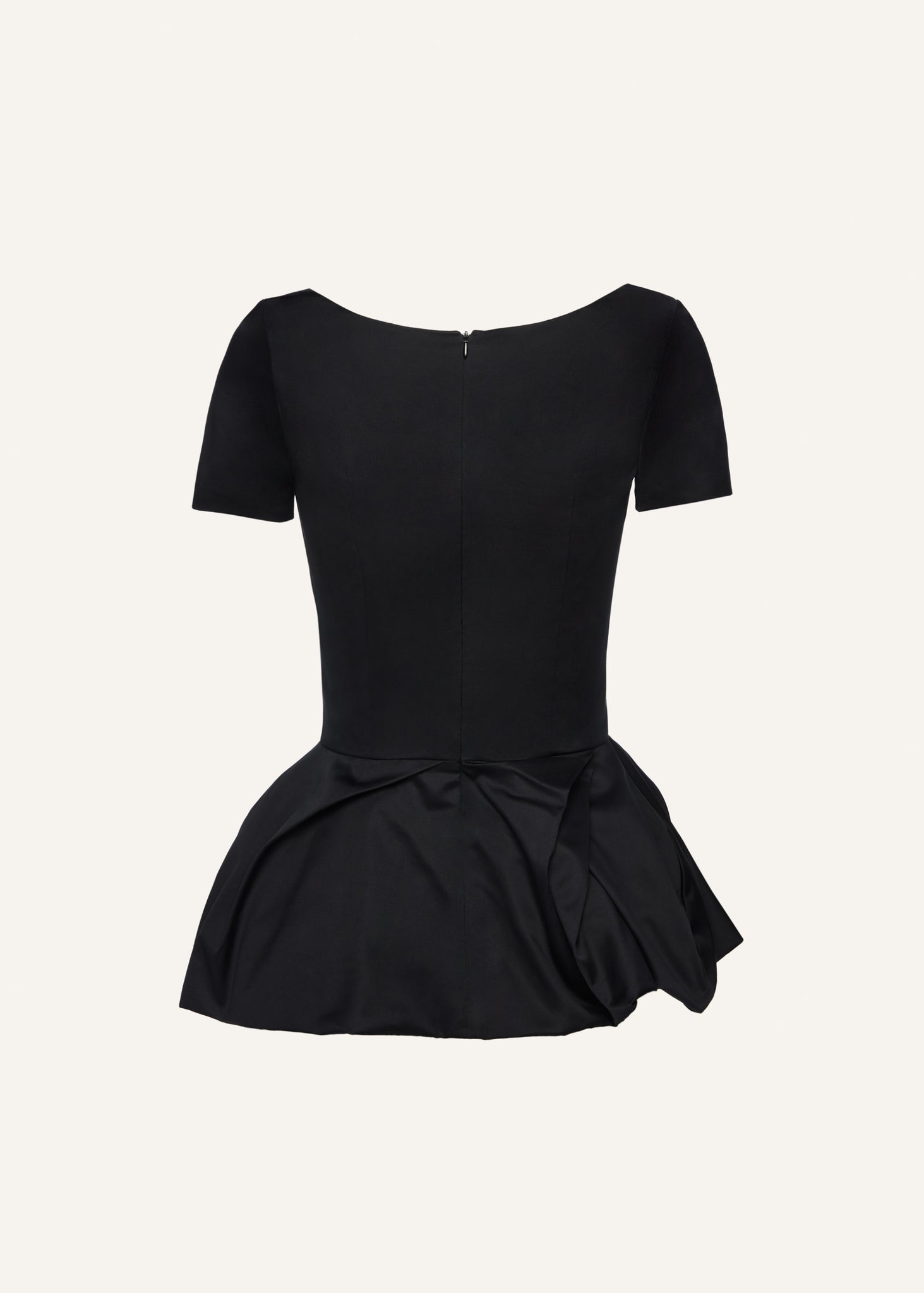 A romantic silk blouse, featuring a wide scoop neckline and short sleeves for a feminine silhouette. The waist is softly cinched with a sculptural peplum detail, creating a flattering shape and fluid movement. A refined yet versatile piece, ideal for pairing with tailored trousers or elevating everyday denim.