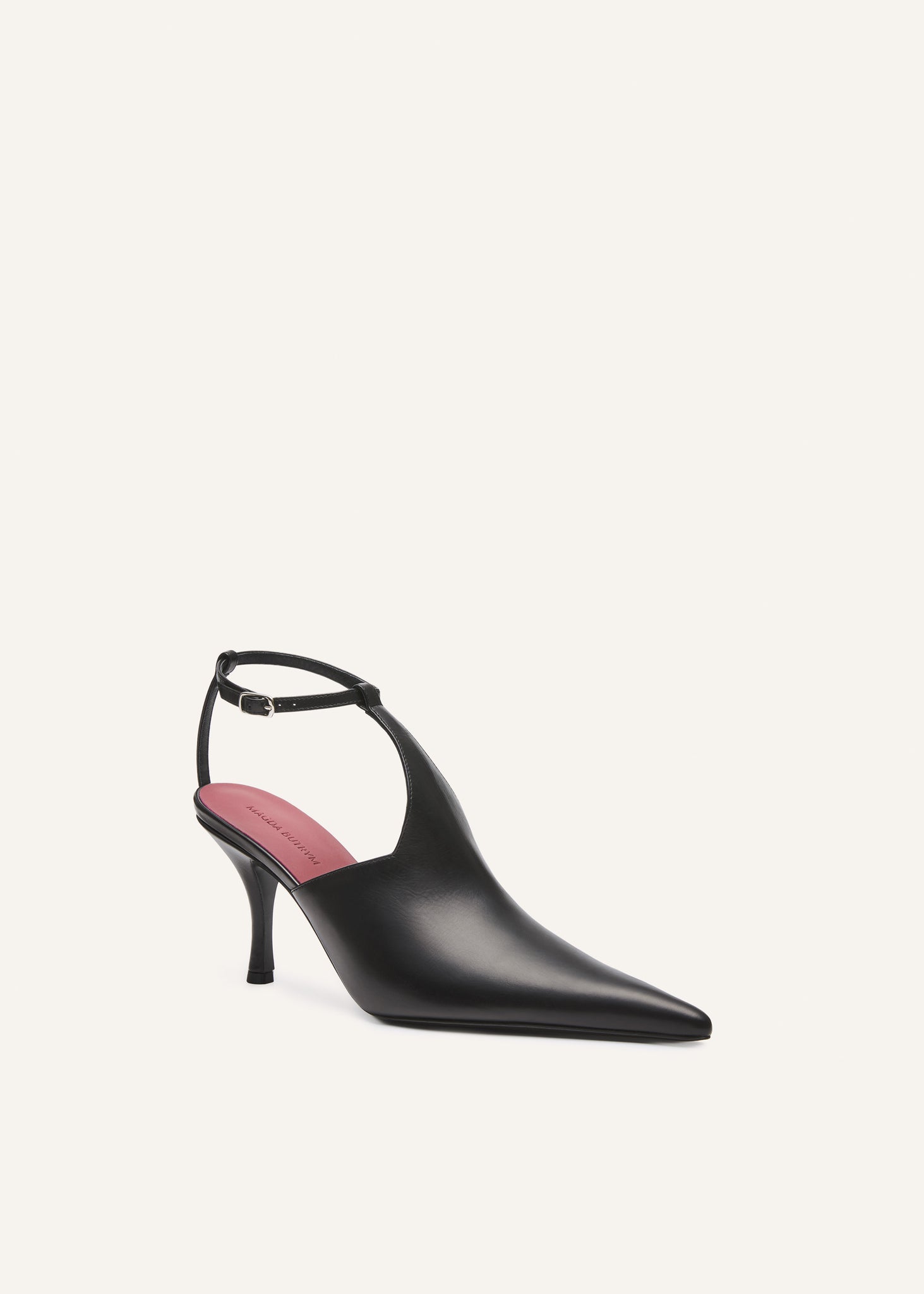 The pointed-toe leather heels with a delicate ankle strap blend sophistication with bold design. With their sleek contours and mid-height stiletto heel, these shoes are a timeless choice for any formal or modern outfit. Whether paired with tailored trousers or a dress, they ensure a refined finish.