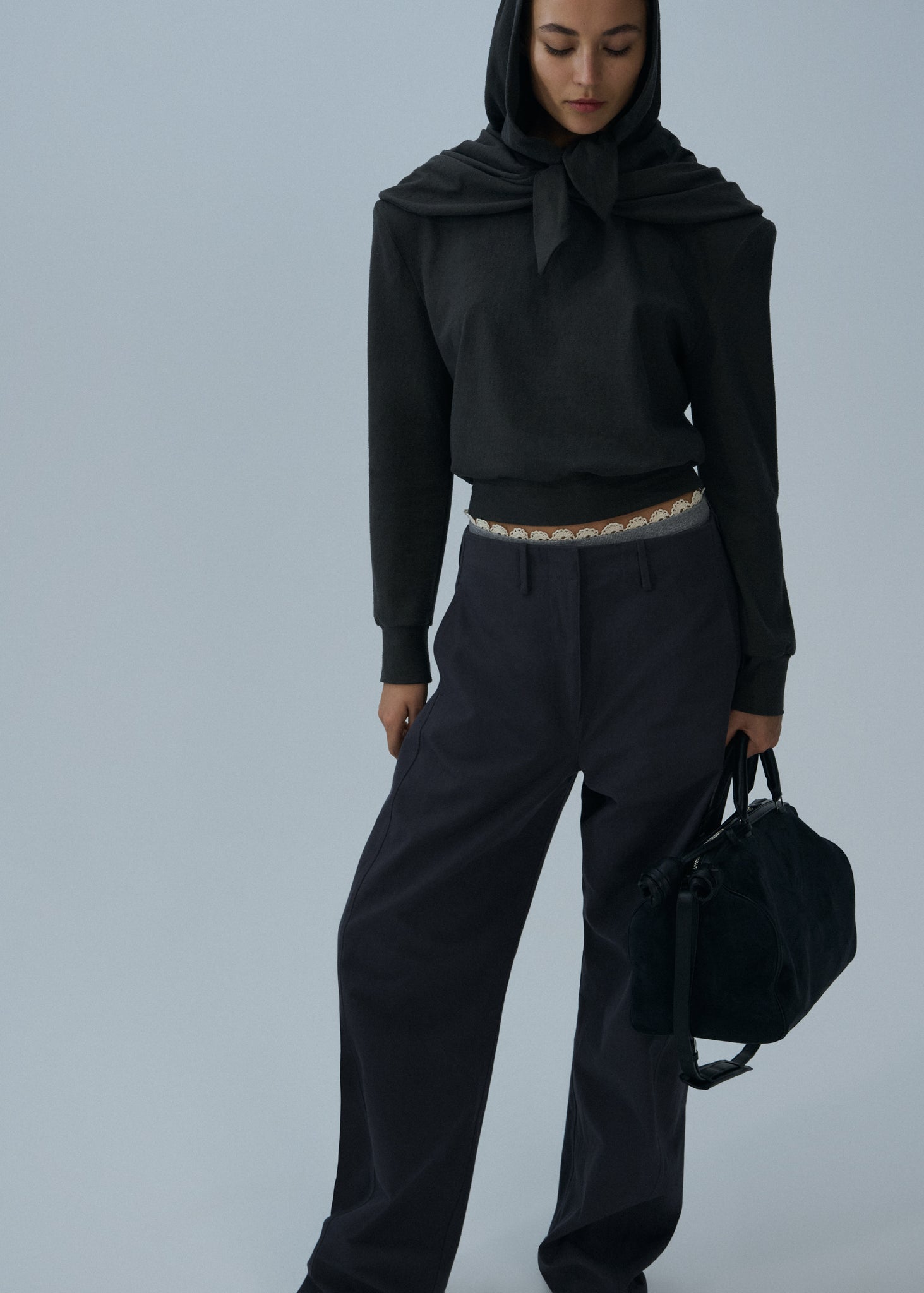 A shoulder padded sweatshirt with a hood that ties under the chin for a slavic feel.