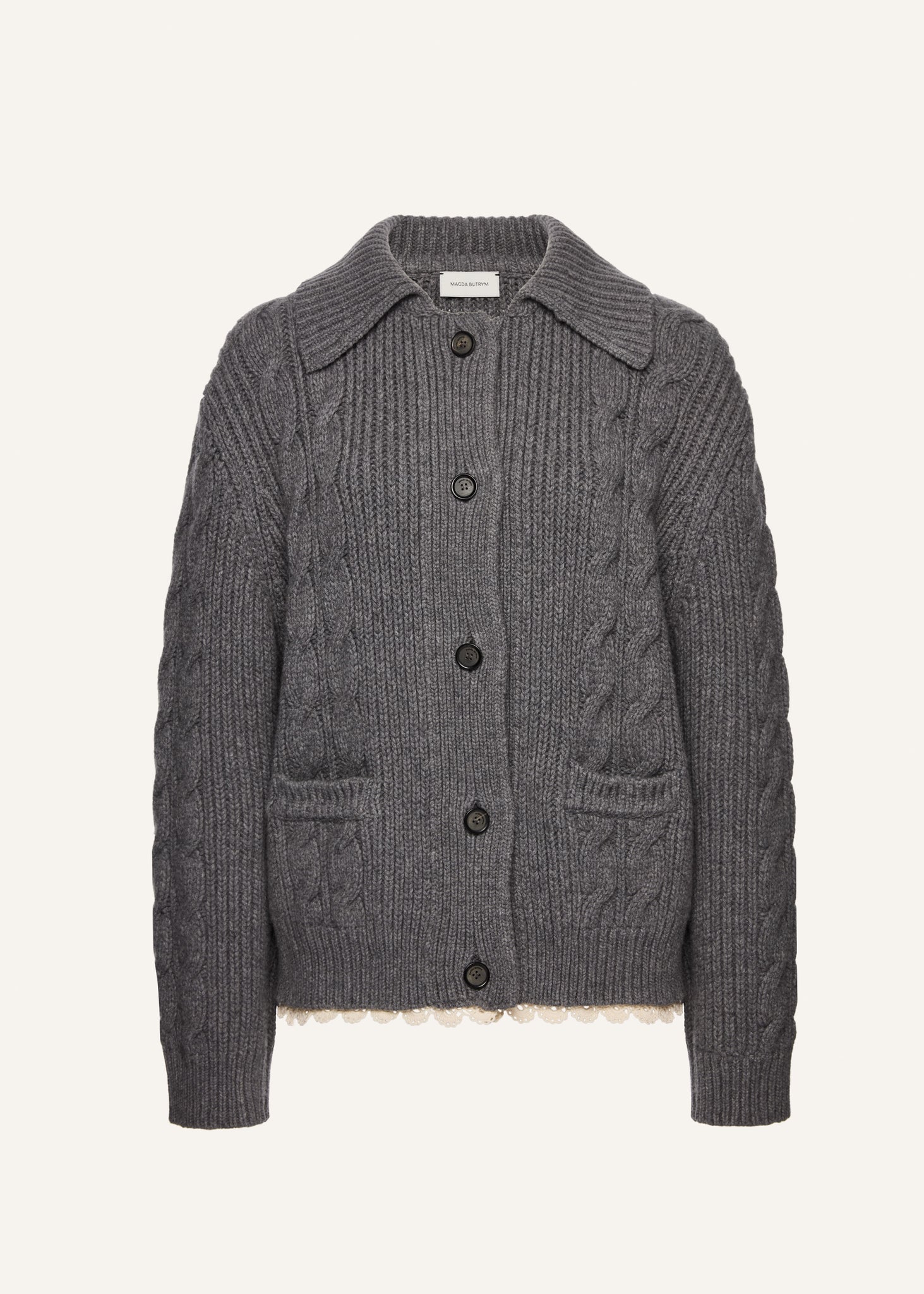 A heavy, thick knit cardigan that can double as outerwear has a classic cable knit pattern and Magda's signature lace crochet detailing at the hem for a handmade detail to finish off the look.