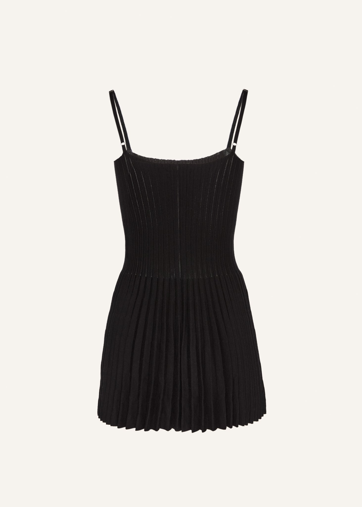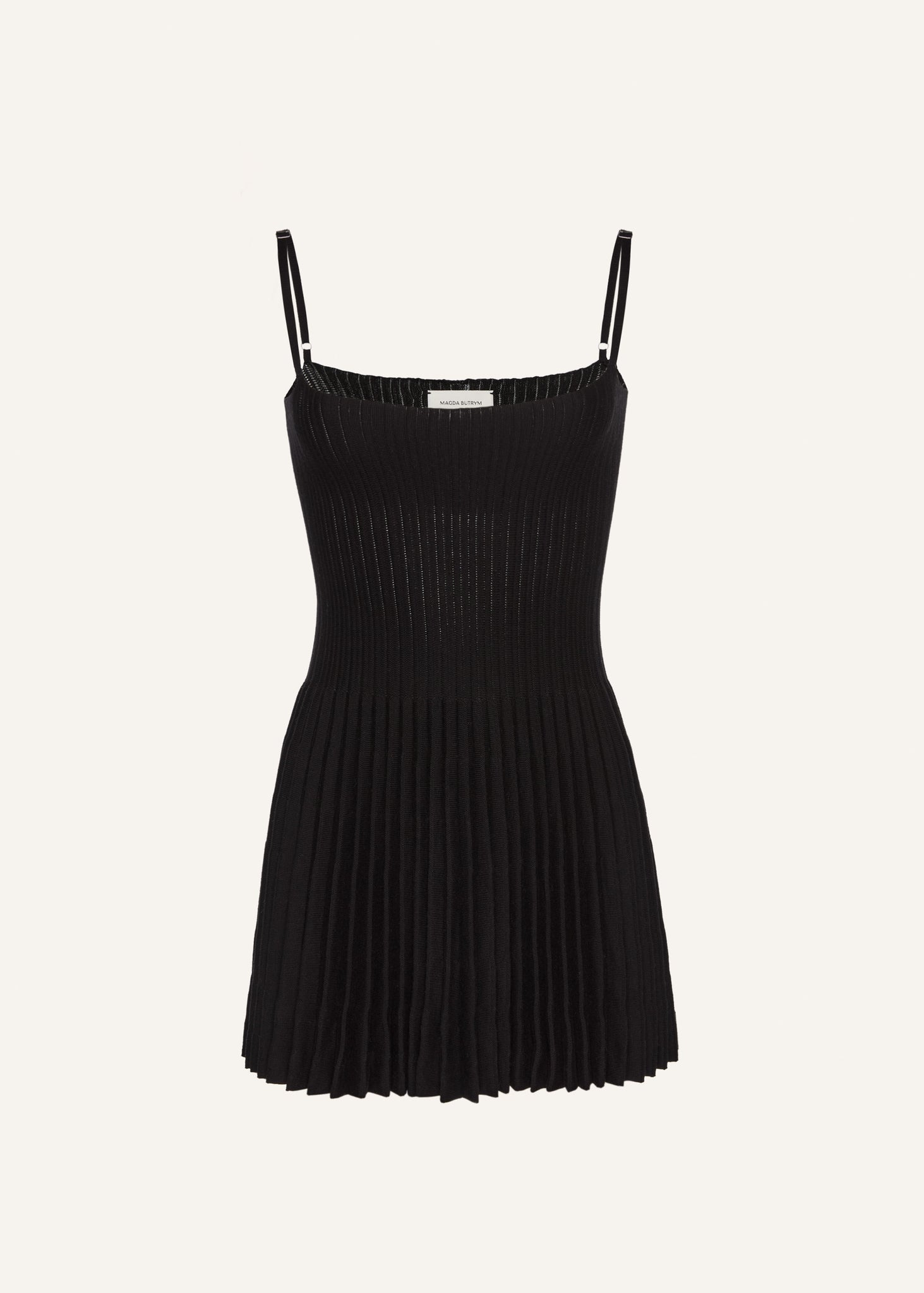 A cotton knitwear skater dress with an accordion skirt and a square neckline.