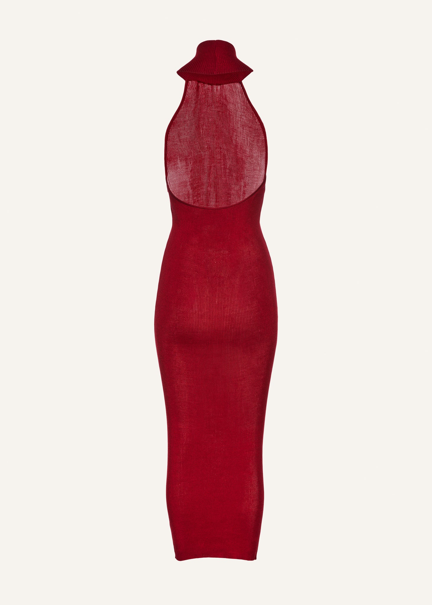 A simple silk knit midi dress with a form-fitting shape and a high turtleneck.