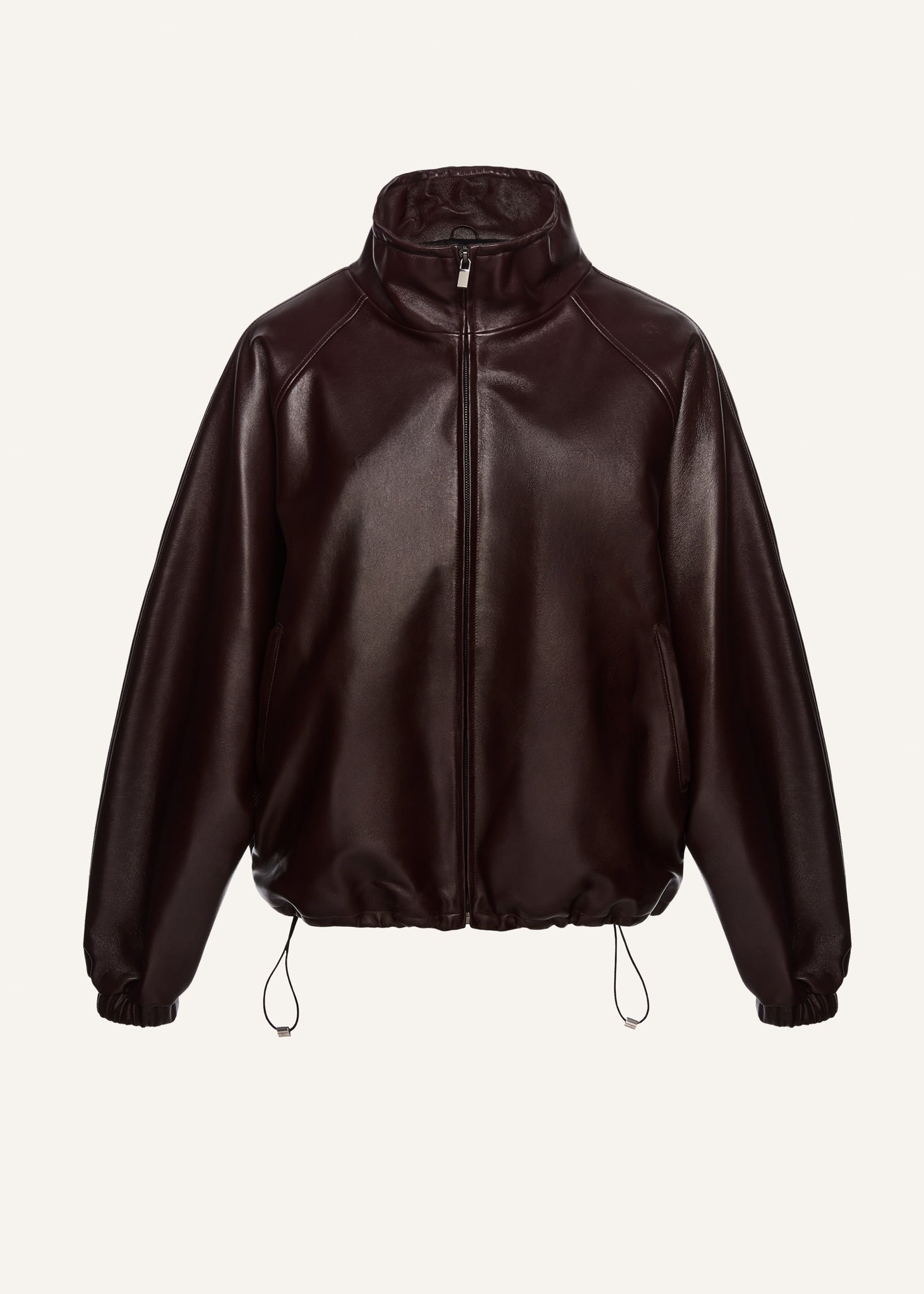 A classic oversized bomber jacket shape with an elasticized hemline to give modernity, and a zip up front closure.