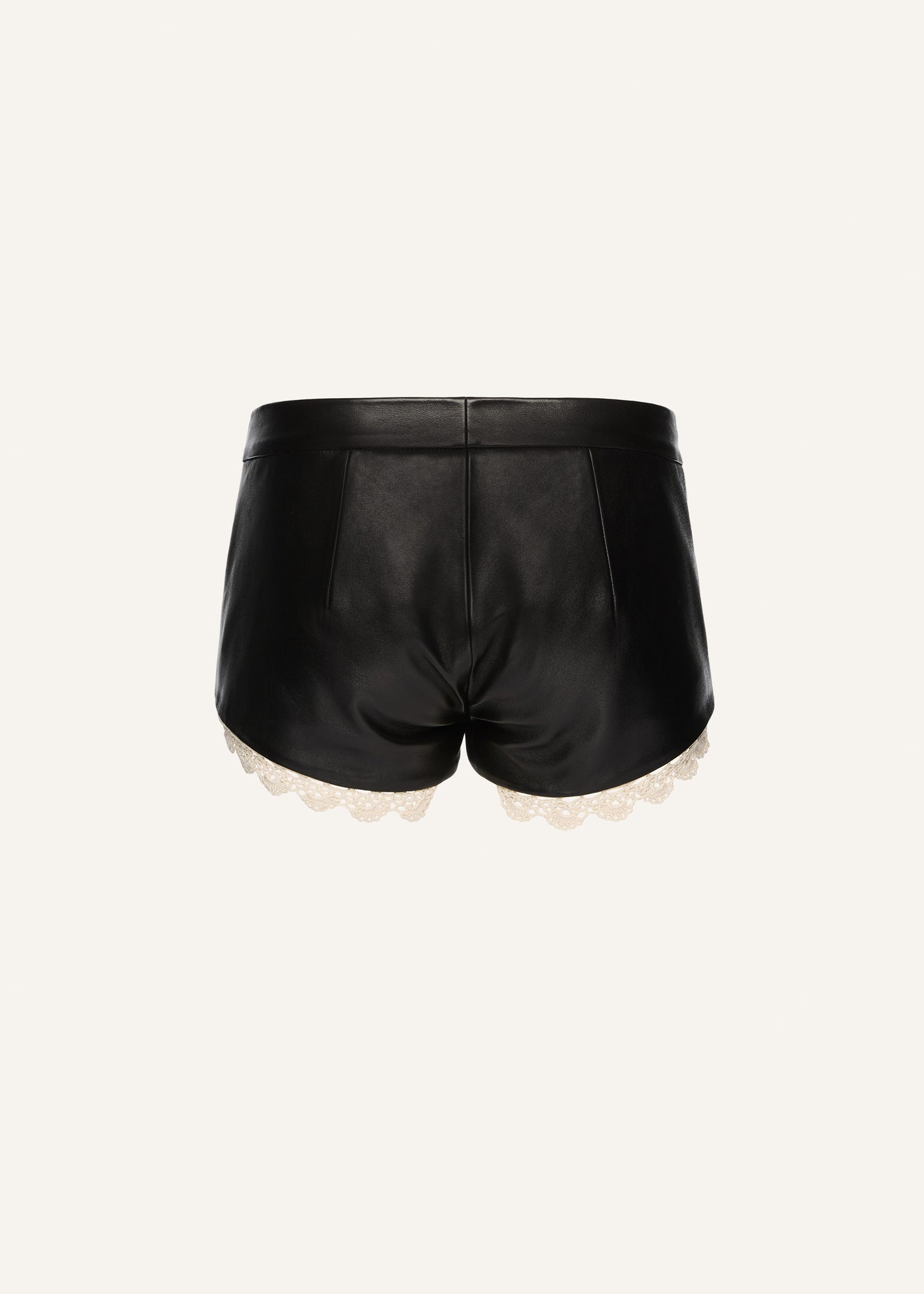 Leather mini shorts with Magda Butrym's signature handmade lace crochet trim.